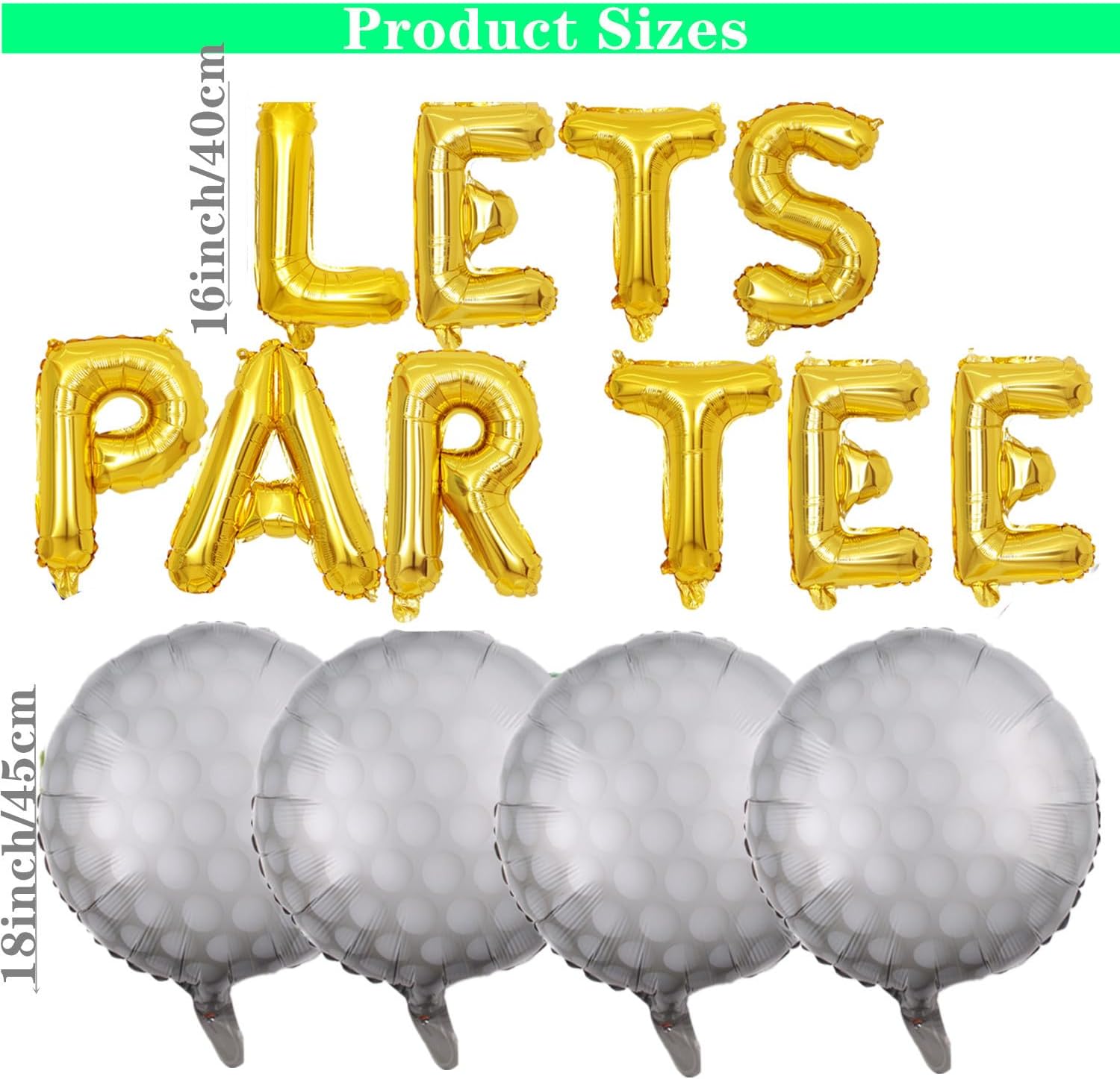 - Golf Party Decoration: 16inch gold letter balloons banner "Lets Partee", 4pc 18inch golf ball balloons, 1pc golf themed banner. The round balloon, featuring a printed design, closely resembles a golf ball in appearance, thereby offering you a realistic ball-like experience. Additionally, we provide one roll of ribbon and two blowing straws for your convenience. Which make your golf themed party very special