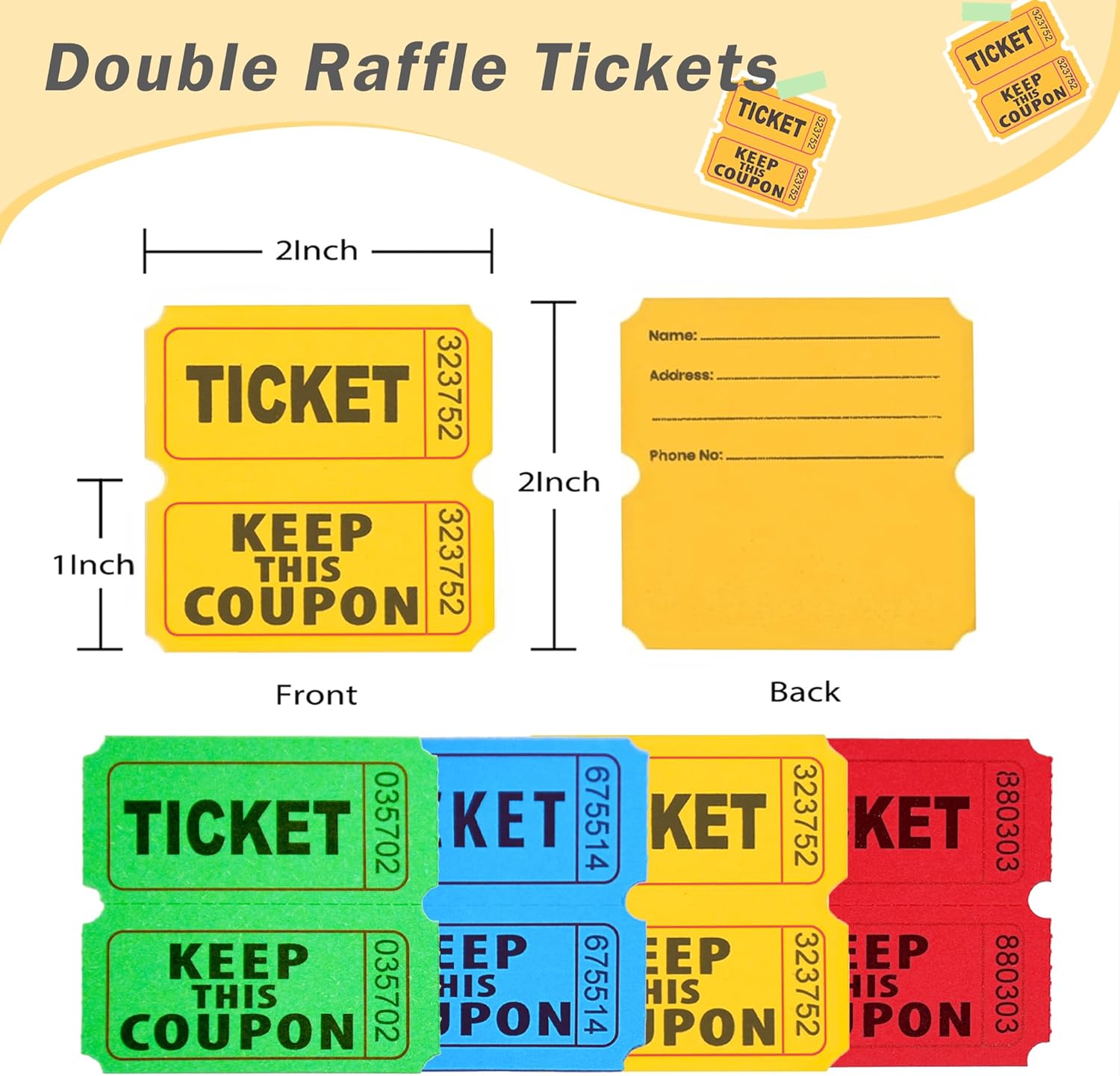 - Double Raffle Tickets -- 4800 raffle tickets, each ticket contains a 2x1" deposit ticket & a 2x1" keep ticket. One ticket measures 2"x2"