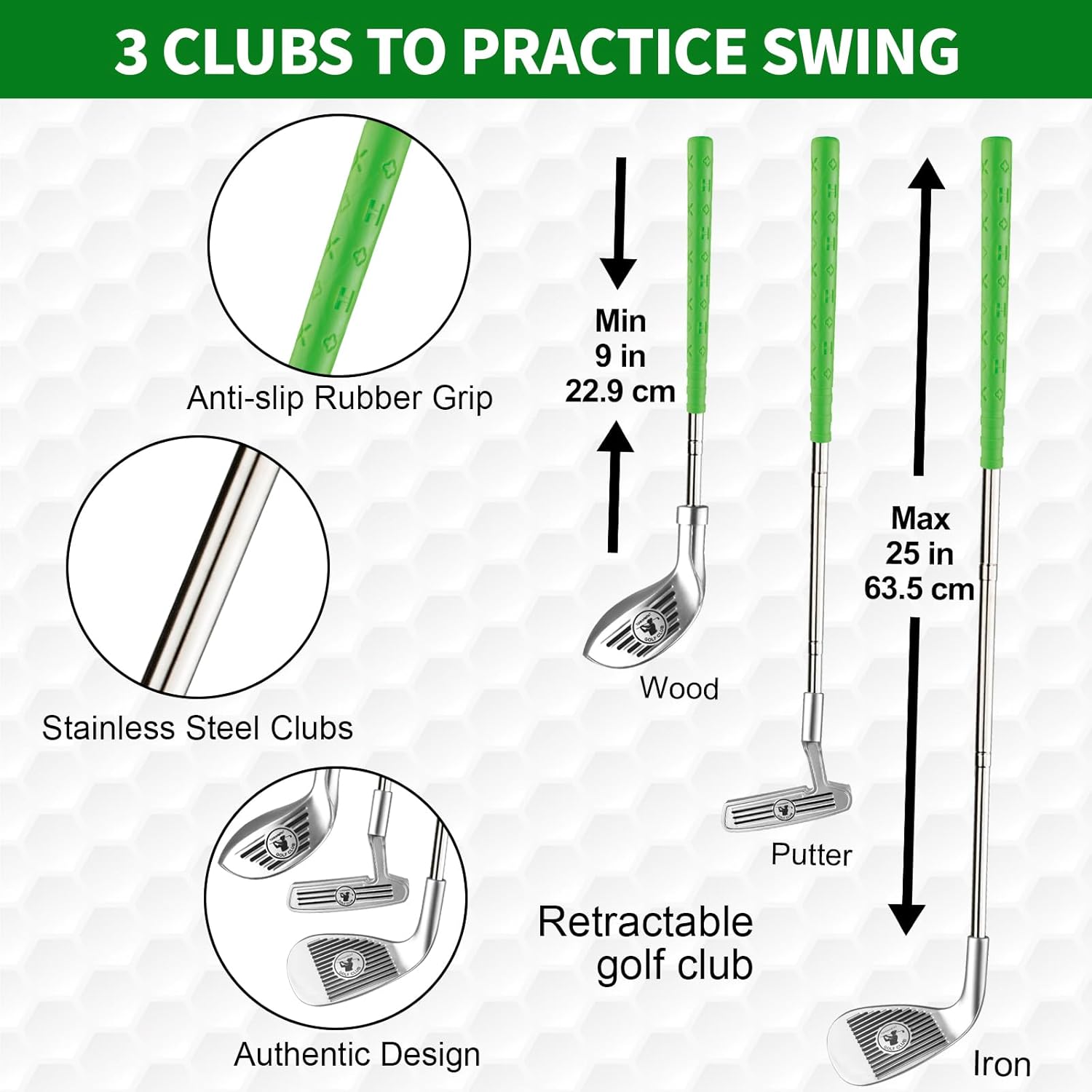 - Retractable Kid-Sized Clubs: Our toddler golf set comes with retractable clubs (iron, wood, putter). Composed of stainless steel shaft and plastic club head, our lightweight and moderate length toddler golf clubs is convenient for kids aged 3-6 to use
