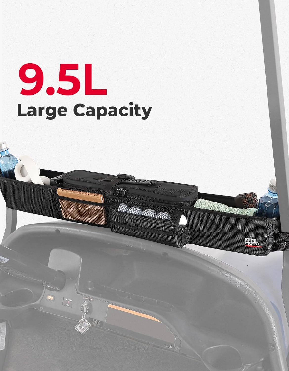 - Ample Storage Space: Our golf cart storage bag is designed with an integrated 9.5L capacity to meet all your storage needs. It includes a square hook-and-loop divider that creates three separate compartments, including a 5L insulated cooler compartment to keep your drinks cold. The exterior elastic mesh pocket offers easy access to items like keys, phones, sunglasses, and wallets, while a dedicated golf ball pocket ensures your cart stays tidy and organized.
