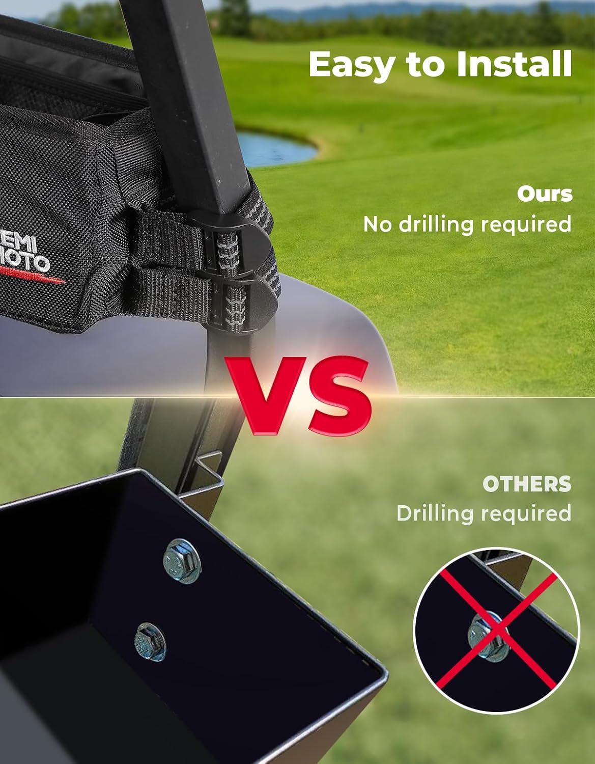 - Easy Installation: No drilling required. Our golf cart storage basket comes with 4 reinforced, anti-slip straps that securely fasten the basket in place, ensuring a firm and stable attachment. The straps are designed to protect your golf cartβs frame, preventing any potential damage during installation or use. This hassle-free setup allows you to quickly attach or remove the basket as needed, making it a convenient and user-friendly addition to your golf cart.