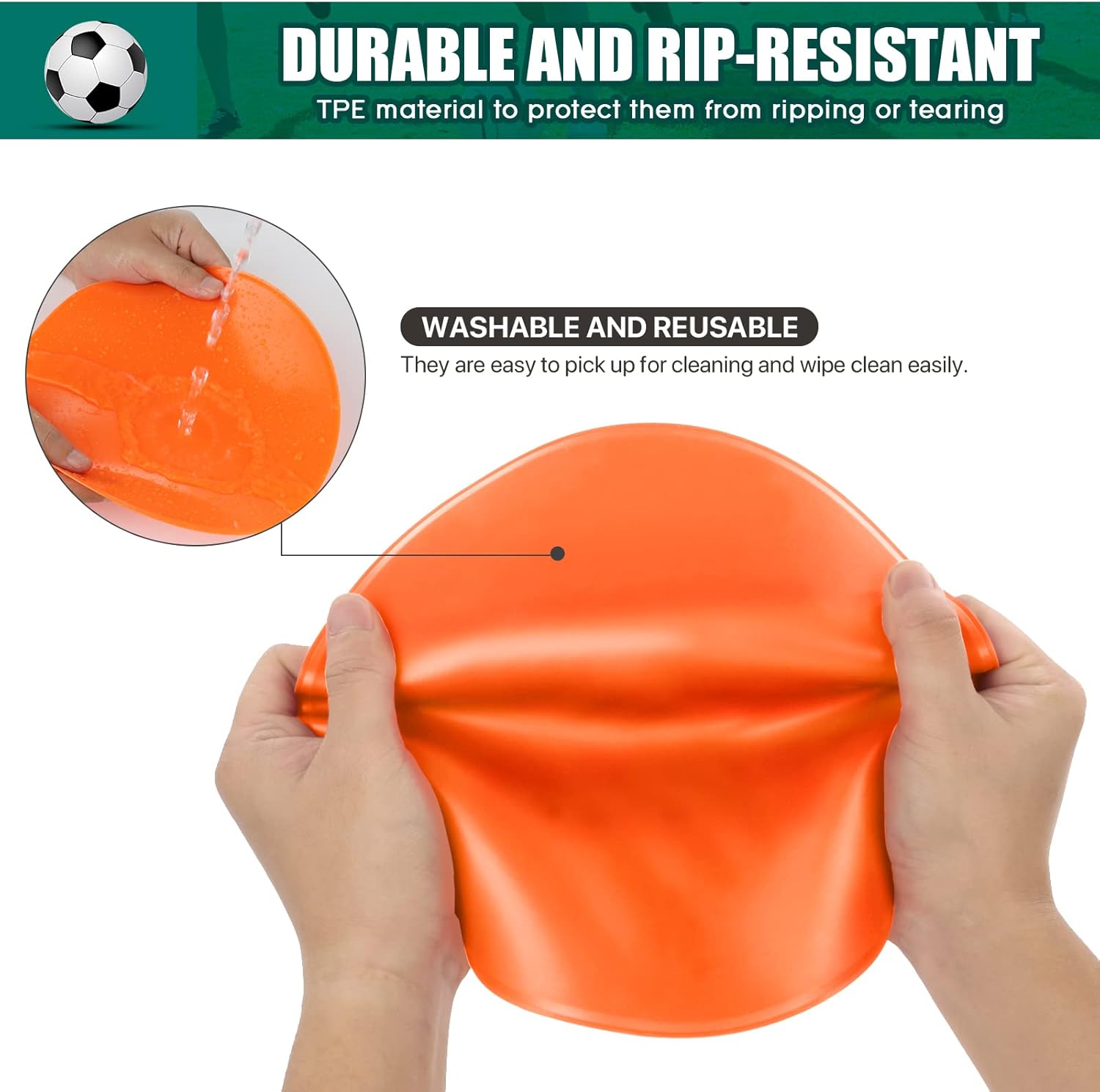 - 【PERFECT FOR OUTDOOR AND INDOOR ACTIVITIES】6 inch diameter, 0.08 inch thickness will not block balls. Big size makes these flat cones for sports training useful for a variety of sports in gym class or agility drills when practicing basketball, football, soccer, baseball, volleyball and any other activities