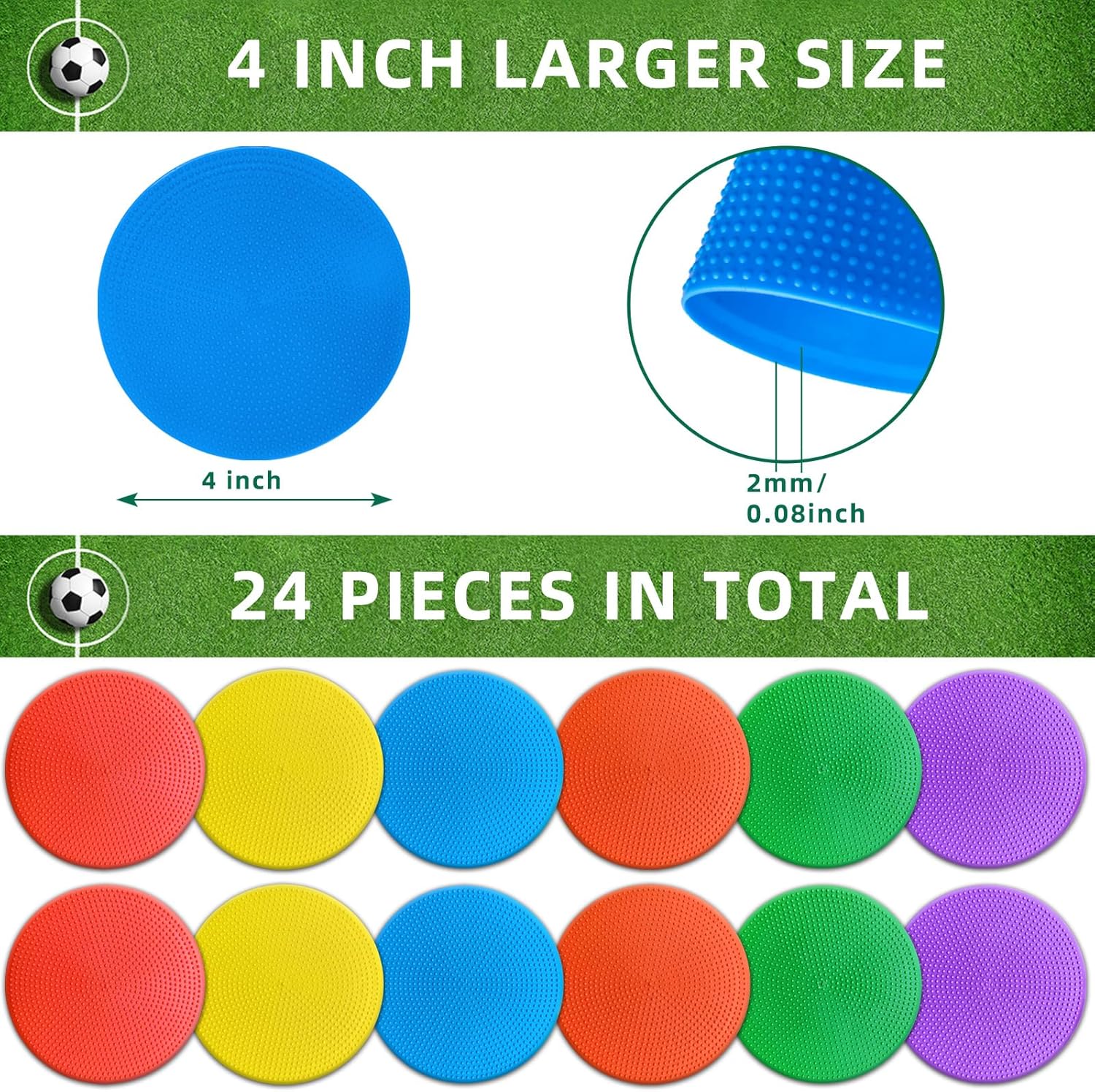 - 【PERFECT SIZE】4 inch diameter, 0.08 inch thickness will not block balls. Big size makes these agility markers useful for a variety of sports in gym class or agility drills when practicing basketball, football, soccer, baseball, volleyball and any other activities