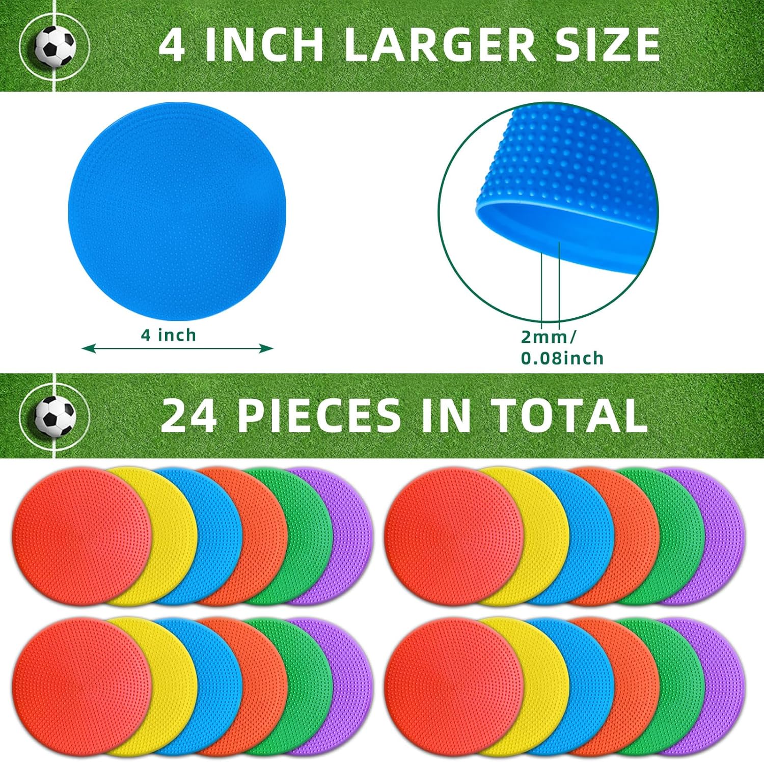 - 【PERFECT SIZE】4 inch diameter, 0.08 inch thickness will not block balls. Big size makes these agility markers useful for a variety of sports in gym class or agility drills when practicing basketball, football, soccer, baseball, volleyball and any other activities