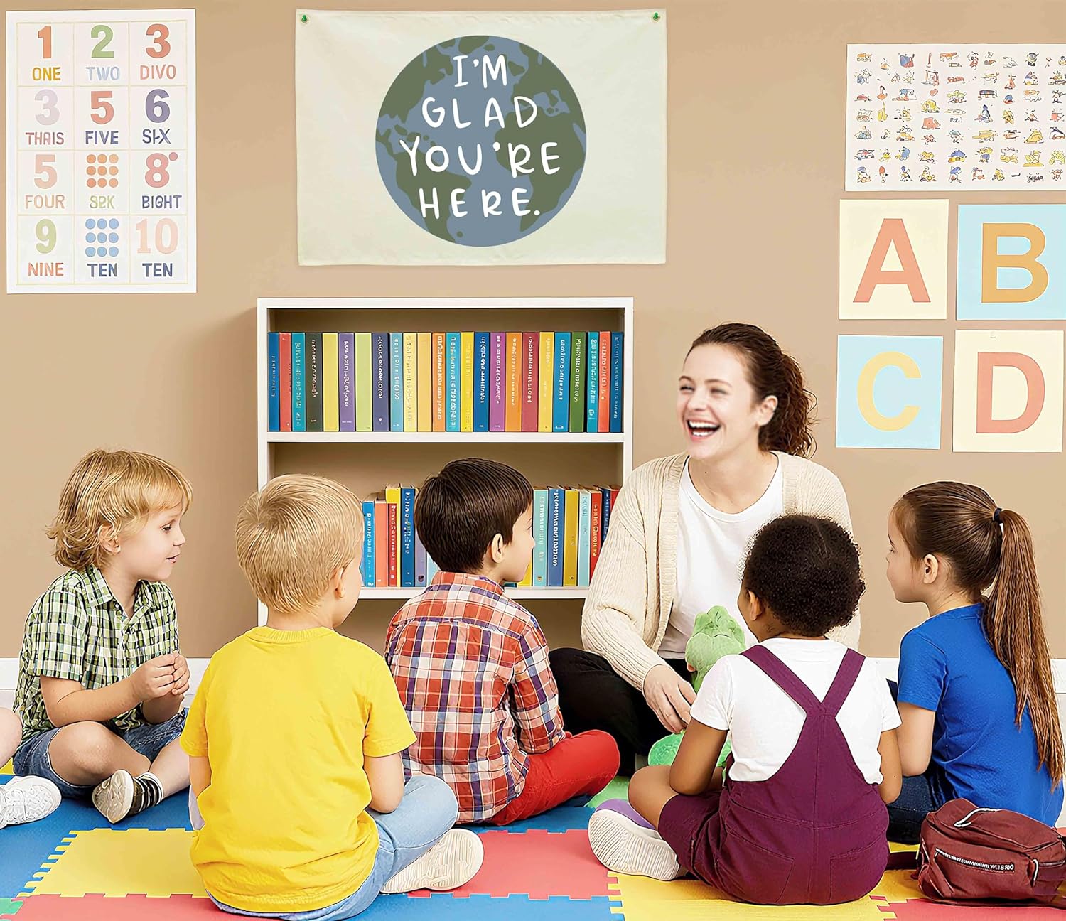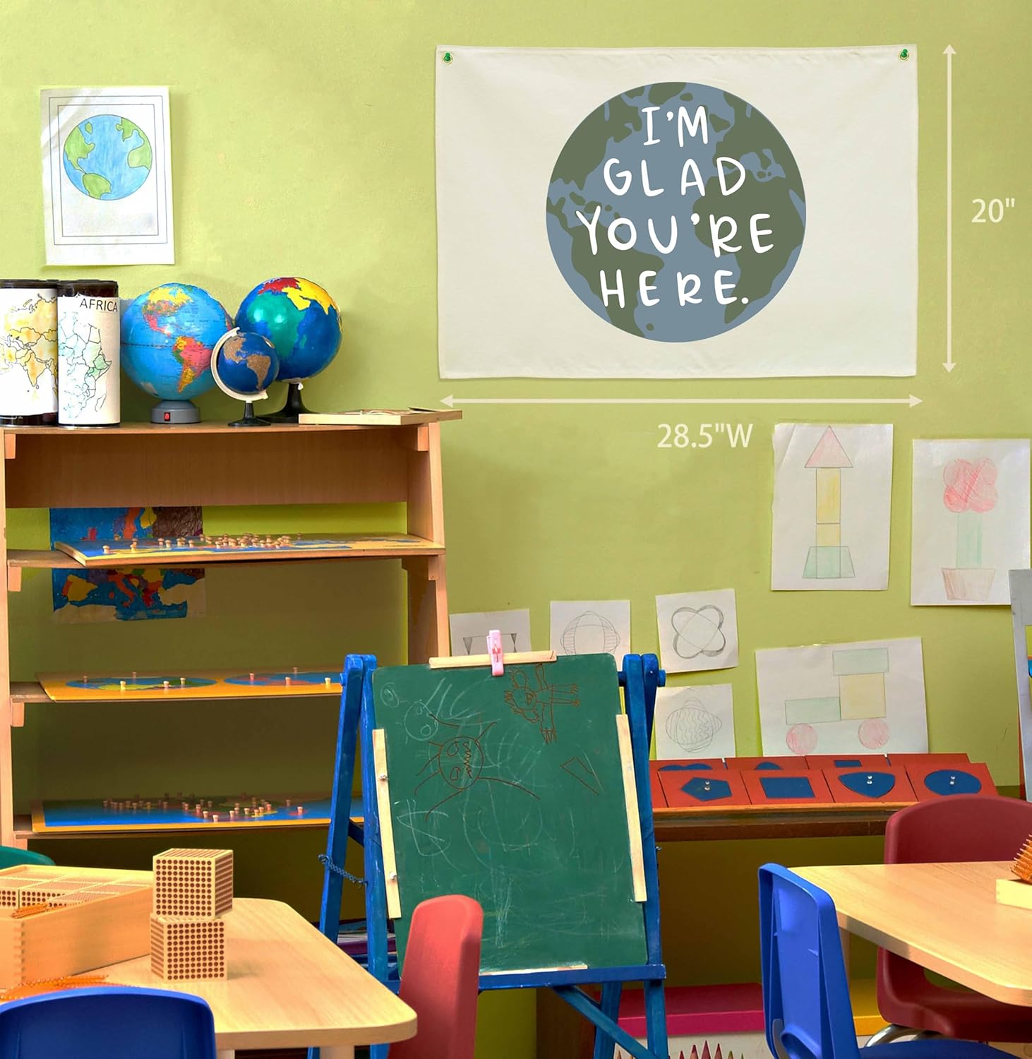 Classroom Wall Decor-Teacher Gifts-Welcome Poster Gift-Nursery Sign- Positive Affirmation Motivational Quote-Earth Theme-Hanging Rectangle Banner Flag Wall Decor-I'm Glad You're Here-28.5"L×20"W