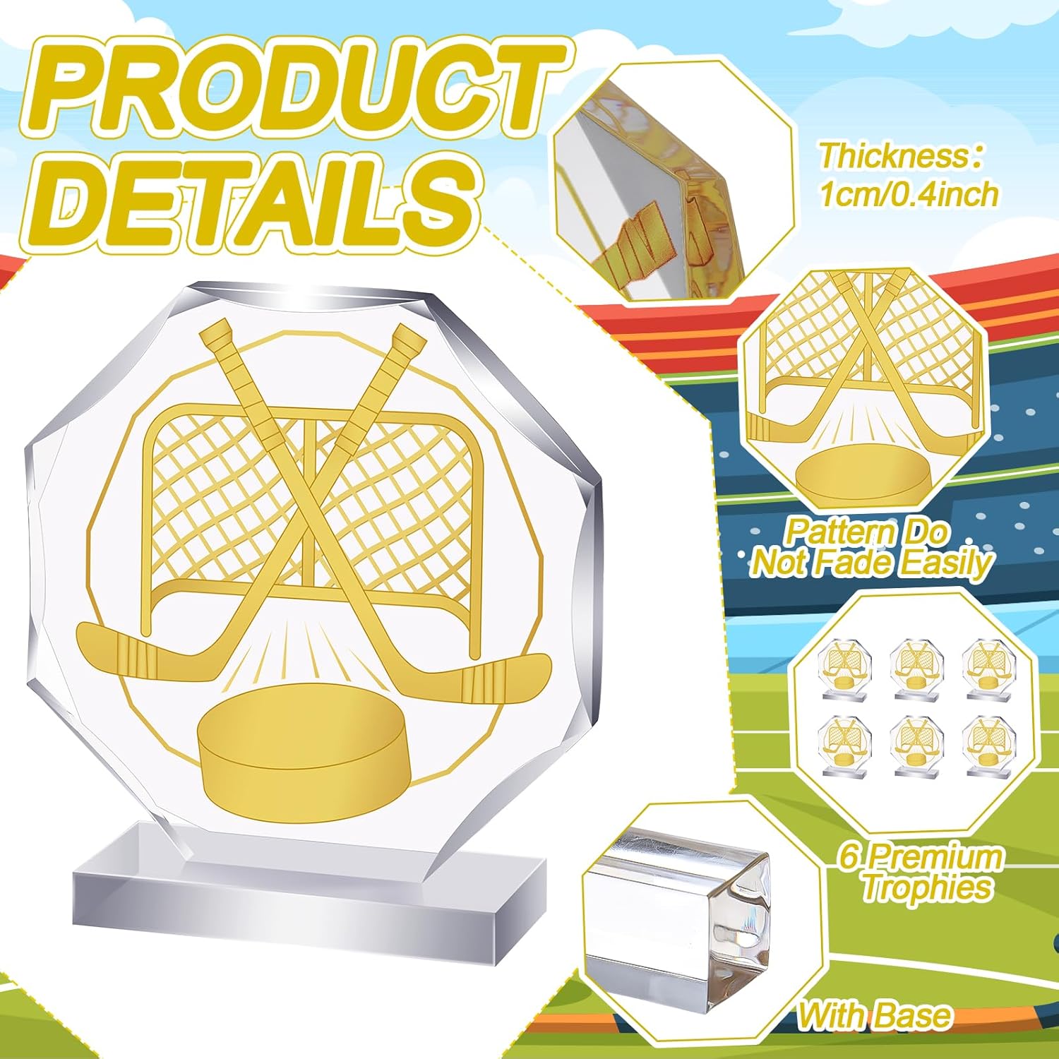 - Appropriate Size: with dimensions of 4.72 x 4.72 inches, the compact size of the hockey medal makes it easy to handle and display; Despite the size, it stands with a robust demeanor, highlighting its sturdy build, which is a result of its quality acrylic construct; The size of base plate is about 3.54 x 0.59 inches