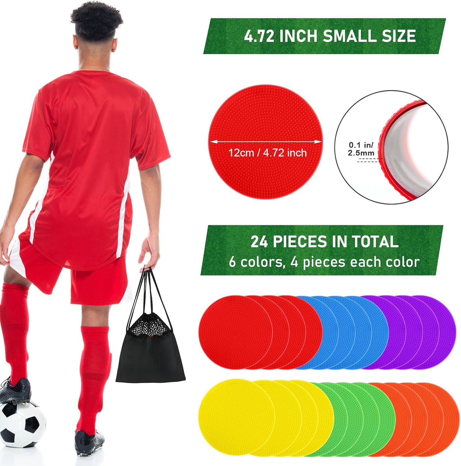 - 【A SET OF 24 POLY SPOT MARKERS】You will receive 24 pieces of floor spot markers and a drawstring bag for easy placement and carrying. Size: 4.72inch/12cm diameter, 0.1inch/2.5mm thickness. 6 different colors, each color four piece