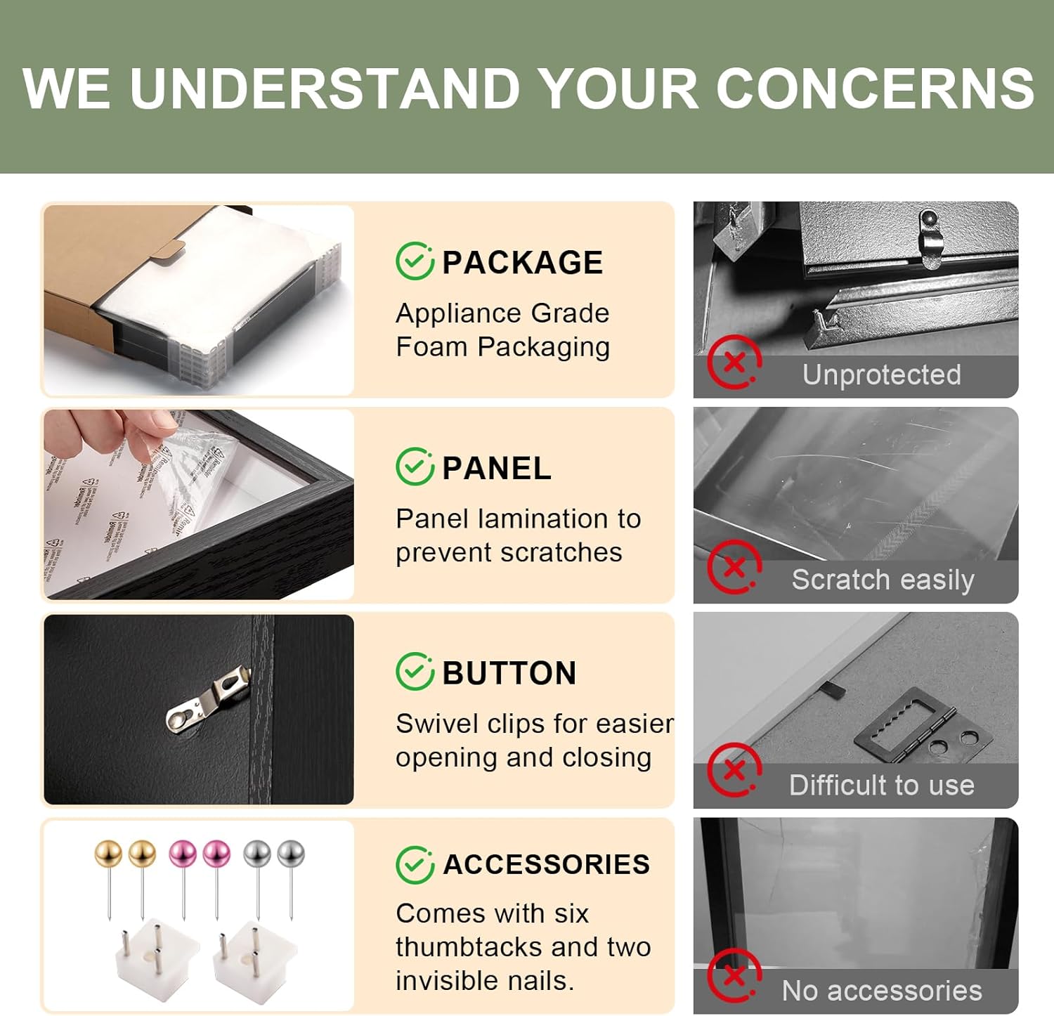- 【Shock-Resistant Foam Packaging】We understand the importance of a perfect unboxing experience! We've upgraded your shadows box frames packaging: reinforced crush-resistant cardboard box (shockproof) + full plastic seal (dustproof) + reinforced corner protectors (impact-resistant) + dual-sided protective film on the front panel (scratch-proof). We meticulously craft our packaging to ensure you receive your shadowbox picture frame flawless and undamaged,ready to preserve every precious moment of your life. Film Removal Tip: Gently peel from a corner,pressing along the edge to avoid leaving marks and maintain its pristine appearance.