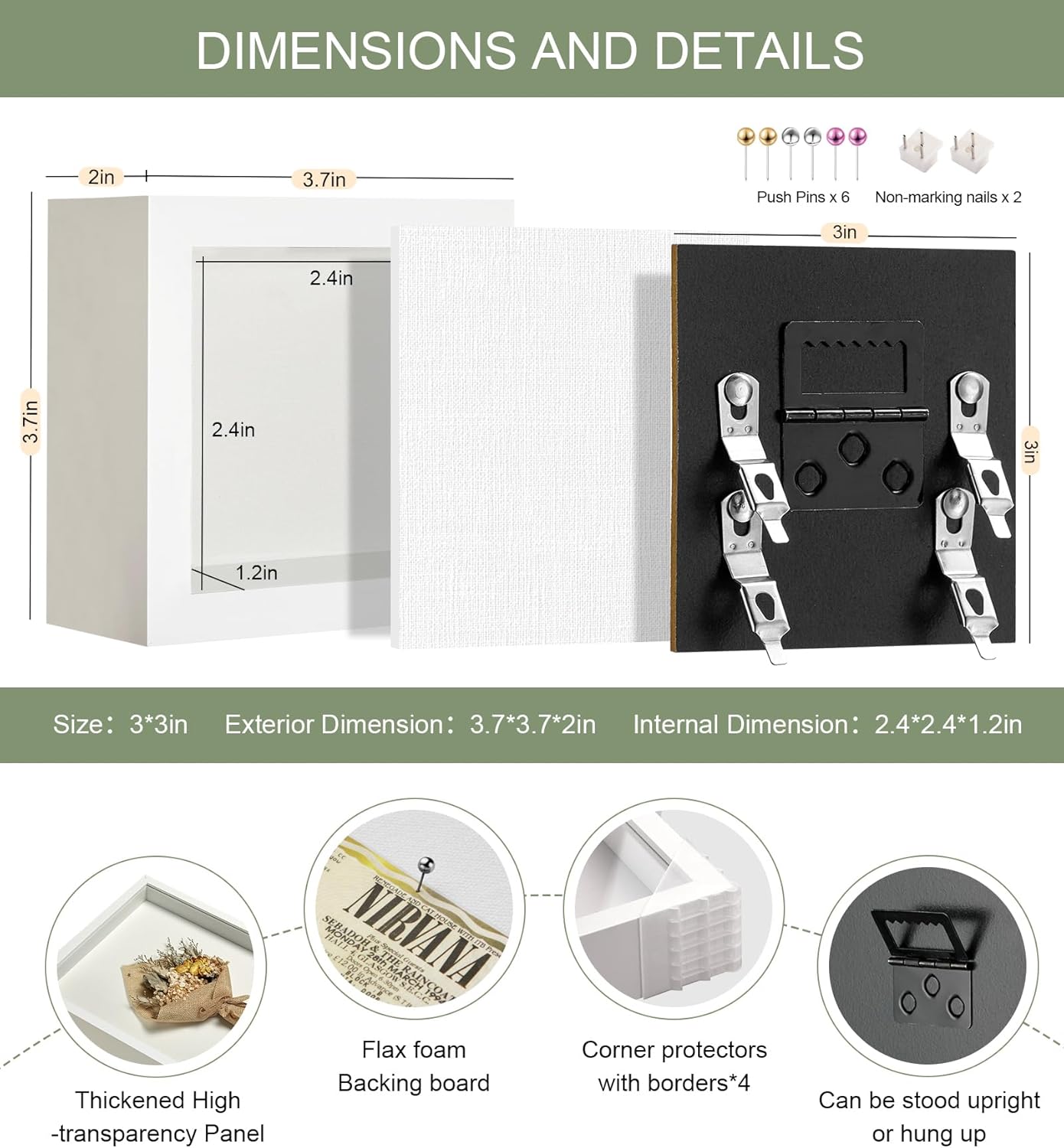 - 【RTZQQIN Shadow Box】This elegant 3x3in shadow box frame features a 0.25in thick white linen backing and 6 push pins,instantly elevating your dried flowers、medals、pets、graduation mementos,and other cherished items into art displays,Effortlessly create your own memory space.