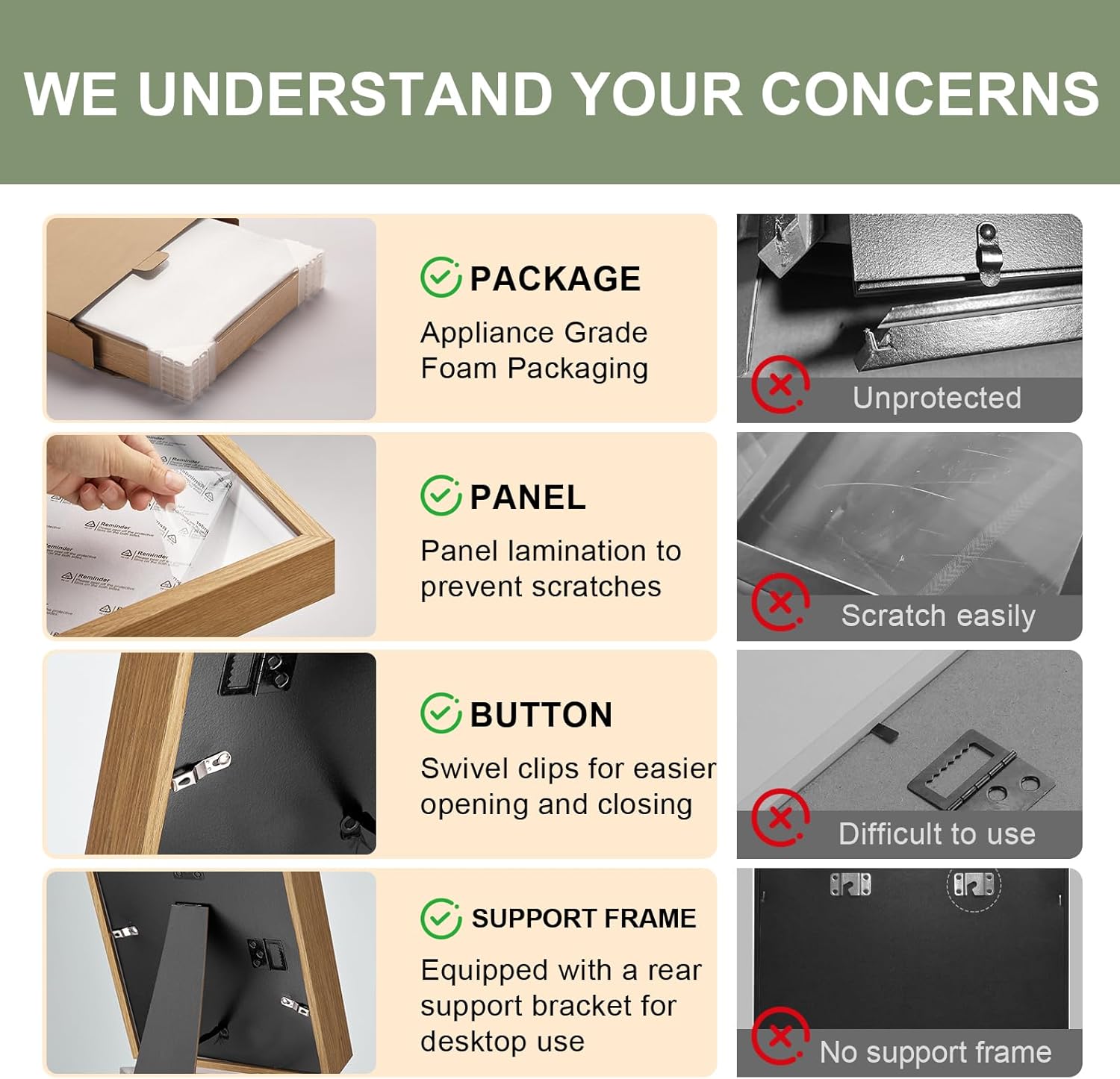 - 【Shock-Resistant Foam Packaging】We understand the importance of a perfect unboxing experience! We've upgraded your shadows box frames packaging: reinforced crush-resistant cardboard box (shockproof) + full plastic seal (dustproof) + reinforced corner protectors (impact-resistant) + dual-sided protective film on the front panel (scratch-proof). We meticulously craft our packaging to ensure you receive your shadowbox picture frame flawless and undamaged,ready to preserve every precious moment of your life. Film Removal Tip: Gently peel from a corner,pressing along the edge to avoid leaving marks and maintain its pristine appearance.