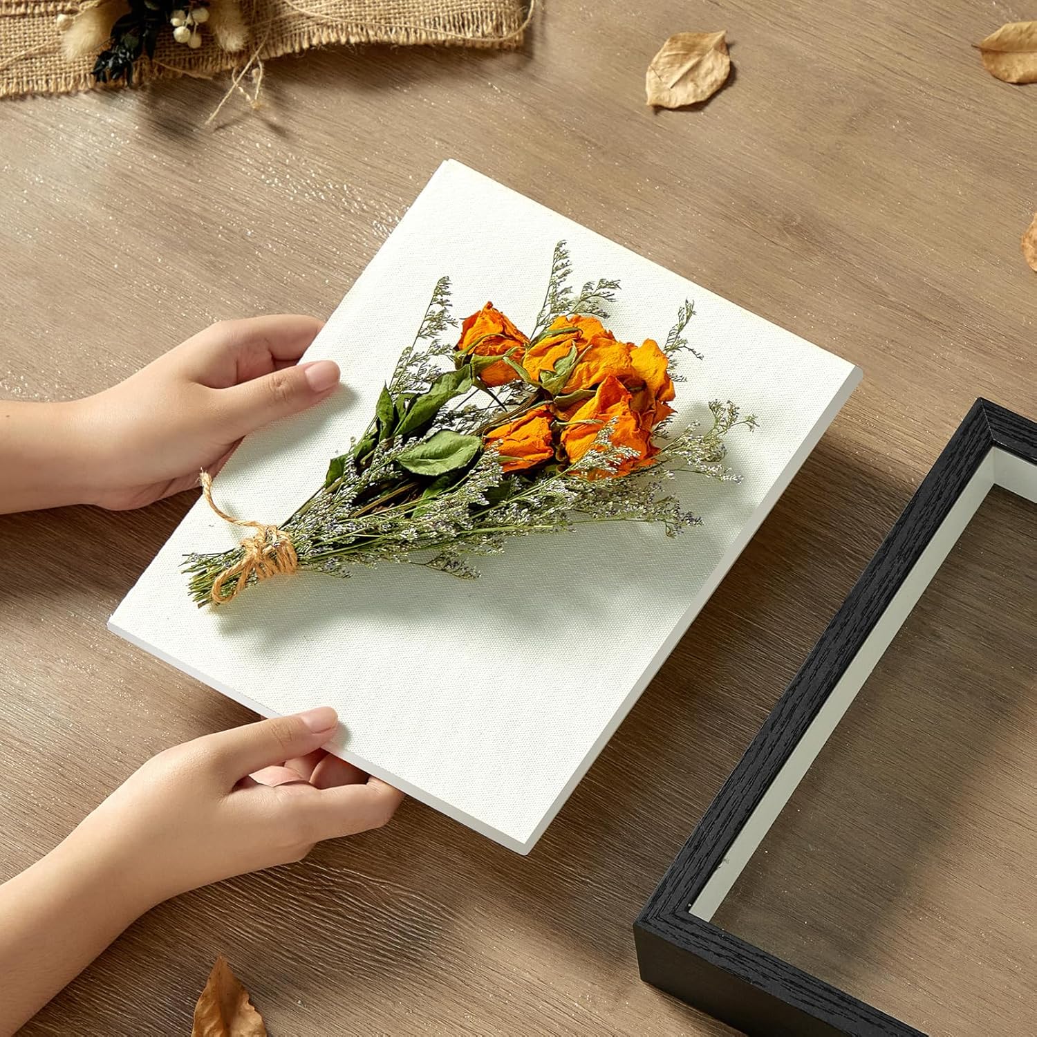 - 【RTZQQIN Shadow Box】This elegant 8x10in shadow box frame features a 0.25in thick white linen backing and 6 push pins,instantly elevating your dried flowers、medals、pets、graduation mementos,and other cherished items into art displays,Effortlessly create your own memory space.