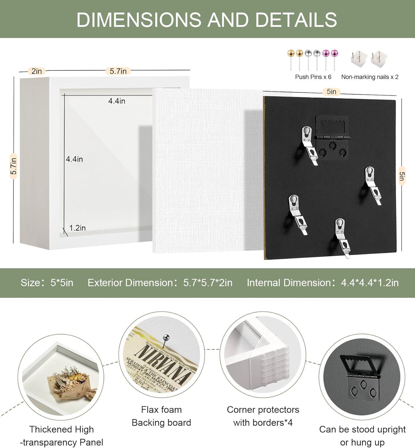 - 【RTZQQIN Shadow Box】This elegant 5x5in shadow box frame features a 0.25in thick white linen backing and 6 push pins,instantly elevating your dried flowers、medals、pets、graduation mementos,and other cherished items into art displays,Effortlessly create your own memory space.