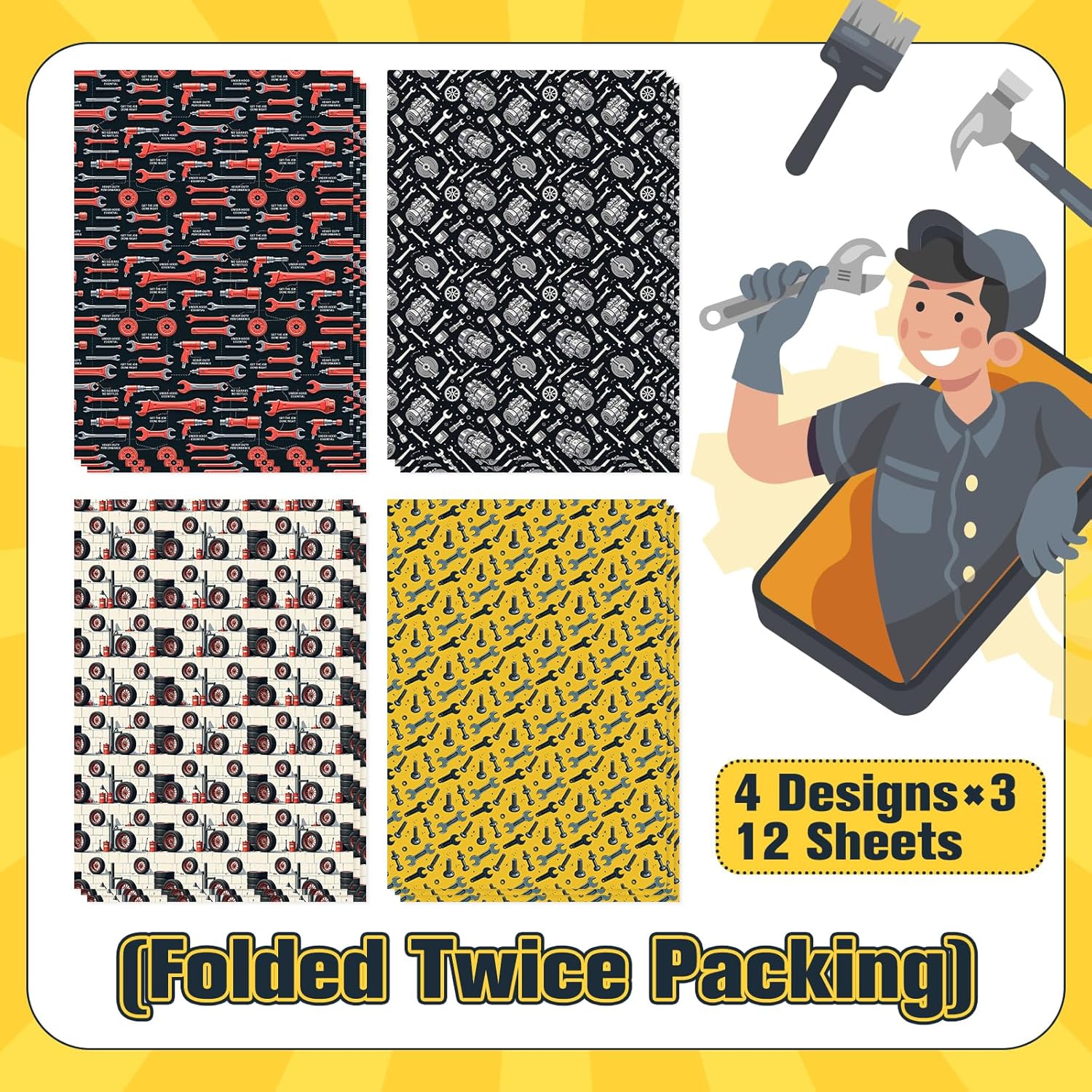 - 12 SHEETS:This mechanic-themed wrapping paper pack includes 12 sheets total,with 3 sheets per design.Each sheet is pre-folded for compact storage and easy use.Ideal for personal gifts or small businesses,this bulk set offers durability and style,making it perfect for car lovers,mechanics,and DIY enthusiasts who appreciate a rugged,tool-inspired aesthetic.