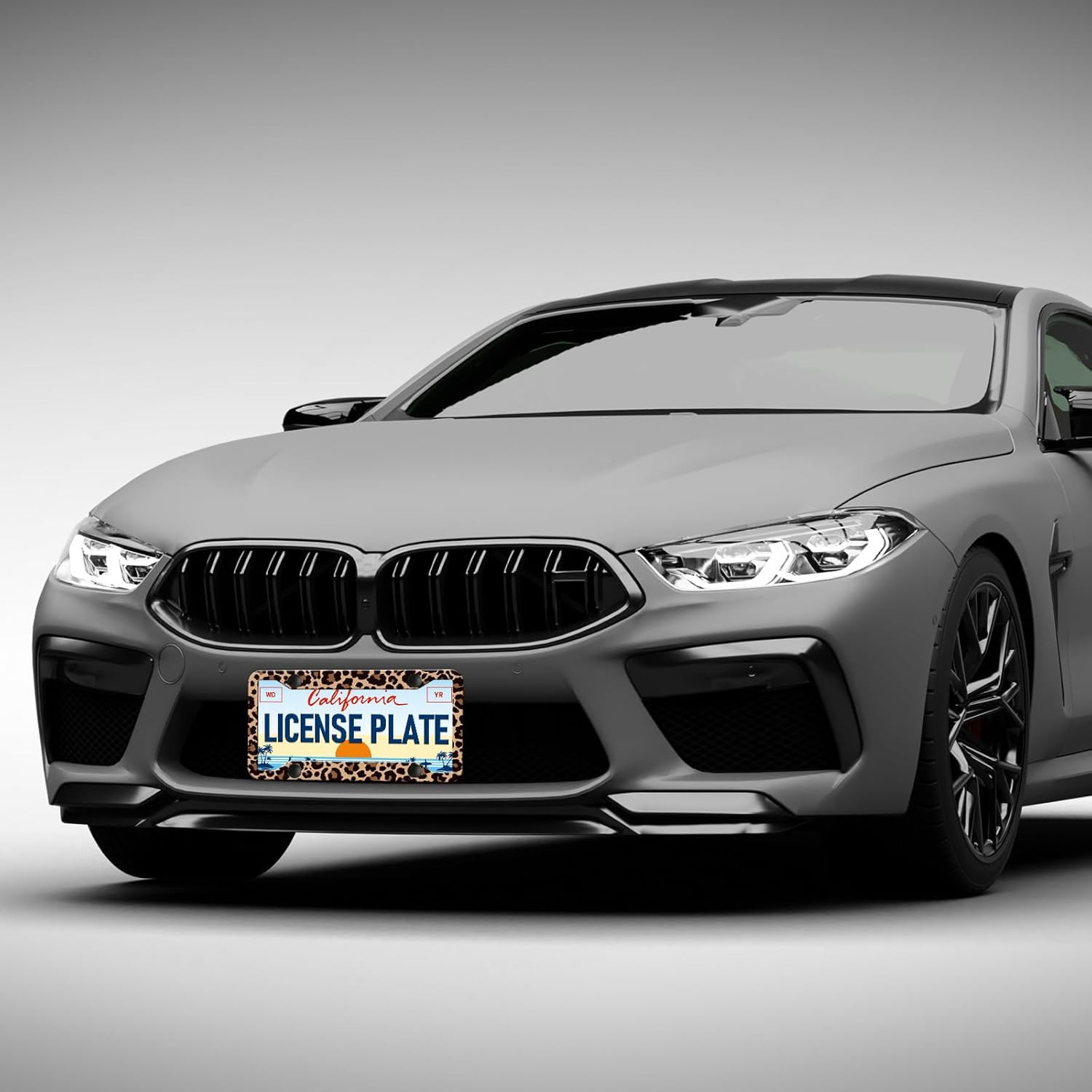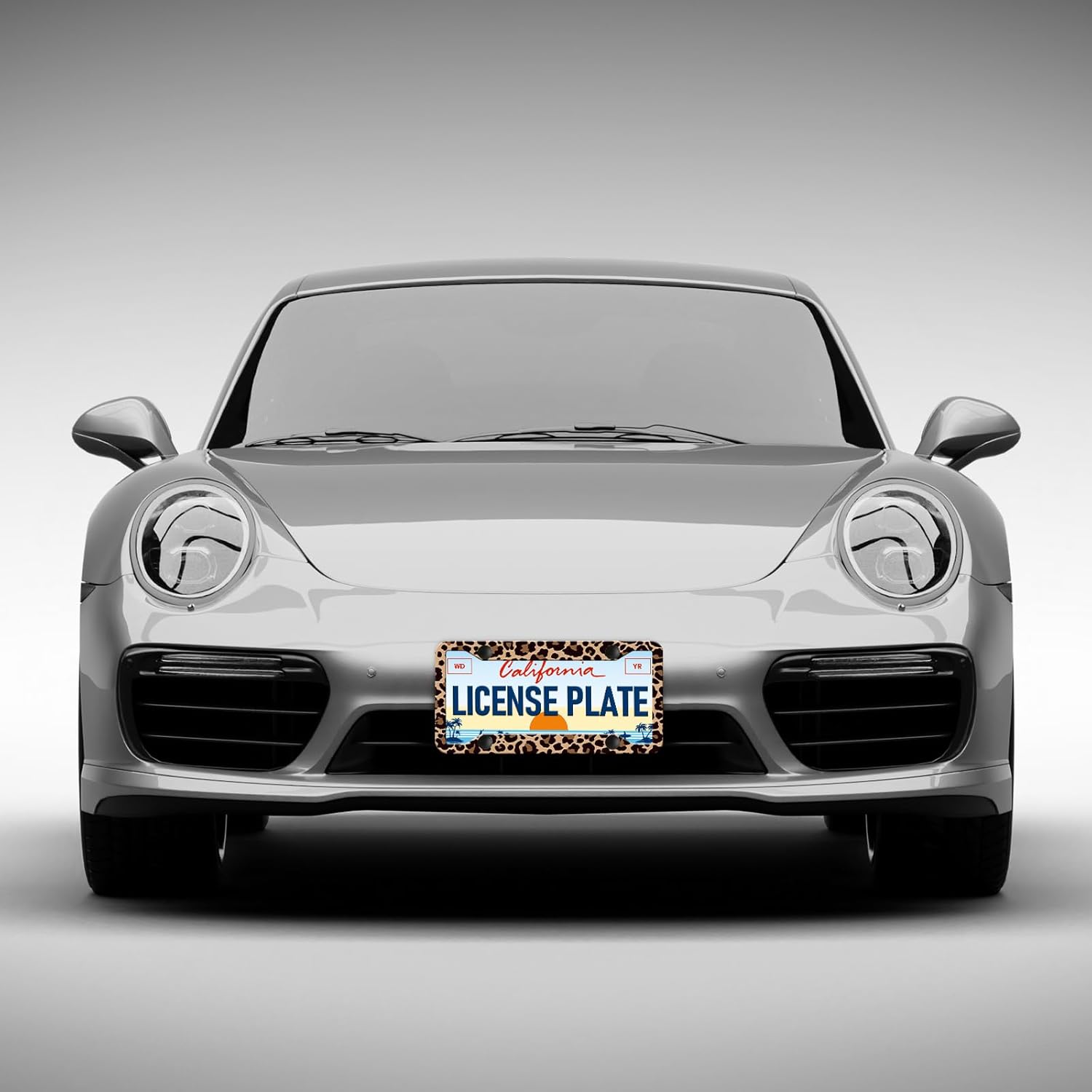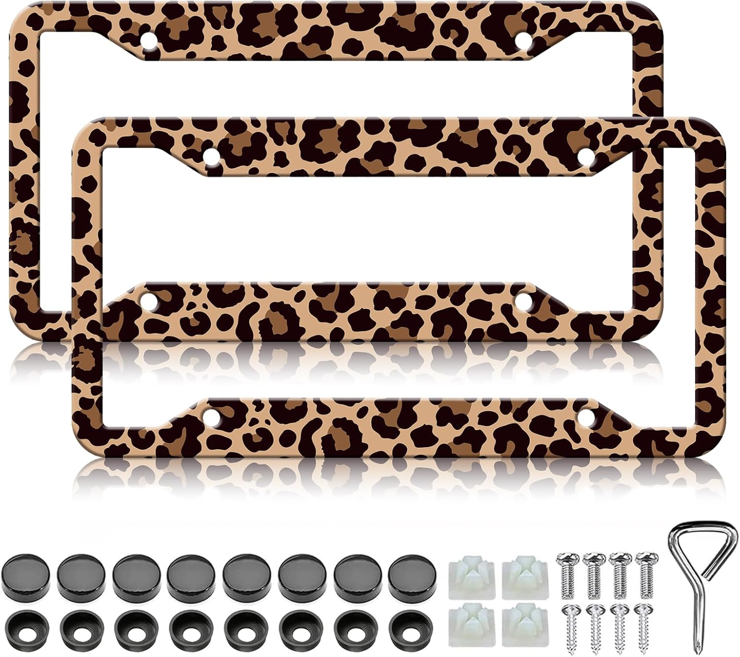 Leopard Print License Plate Frames - 2 Pack Front Rear Animal Brown Cheetah Print License Plates Holder Covers, Aluminum Metal Rust-Proof Waterproof Car Tag Frame with Screws Fasteners Caps