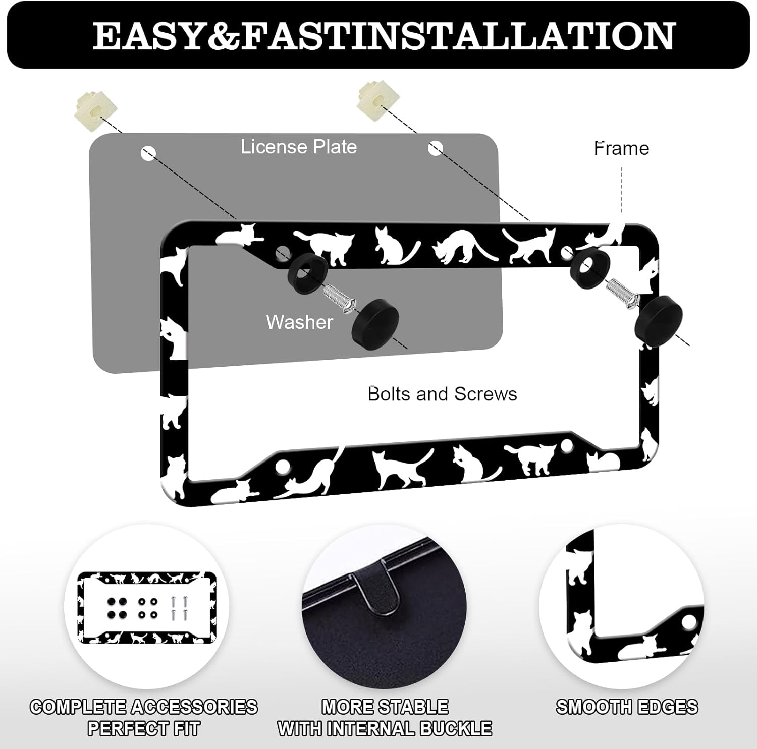 Cat License Plate Frames - 2 Pack Front Rear Cute Cats Pet Animal License Plates Holder Covers, Aluminum Metal Rust-Proof Waterproof Car Tag Frame with Screws Fasteners Caps