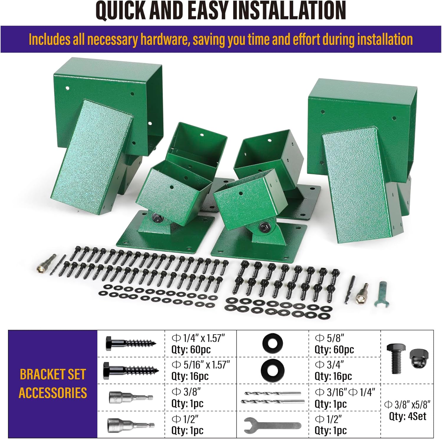 Hulave Stainless Steel Swing Bracket Kit, 4-Pack Swing Set Anchor Leveling Kit Bracket 4"x4"+2pcs A Frame Swing Set Brackets with Mounting Accessories(Green)