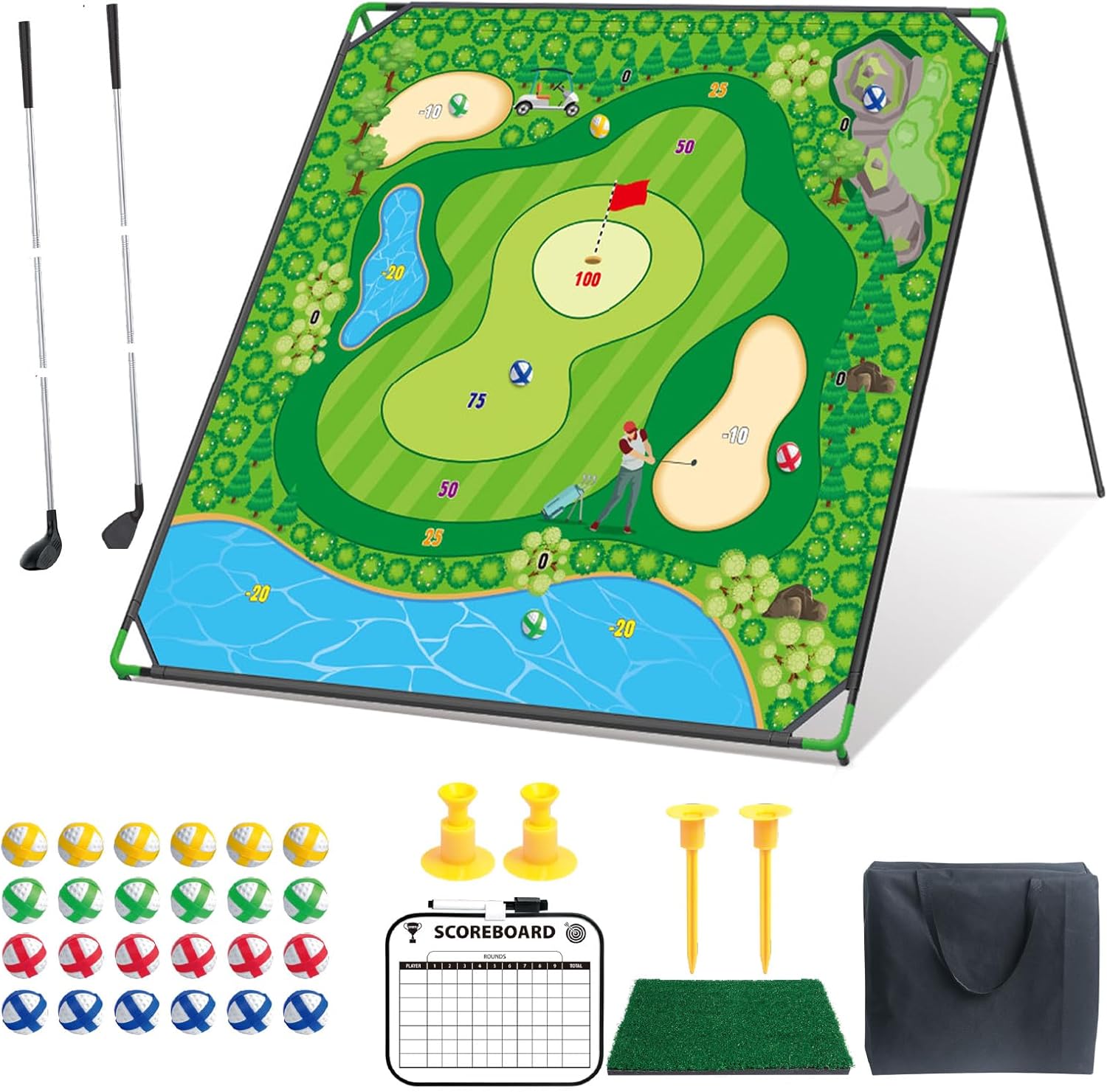 - Large Golf Chipping Game - 71x71'' large chipping mat, 24 sticky golf balls, 2 adjustable golf clubs, 2 hitting mats, 1 scoreboard, 1 carry bag, Ideal for indoor chipping practice, backyard games, or beach golf challenges, ideal gift for dads, adults that golf lovers