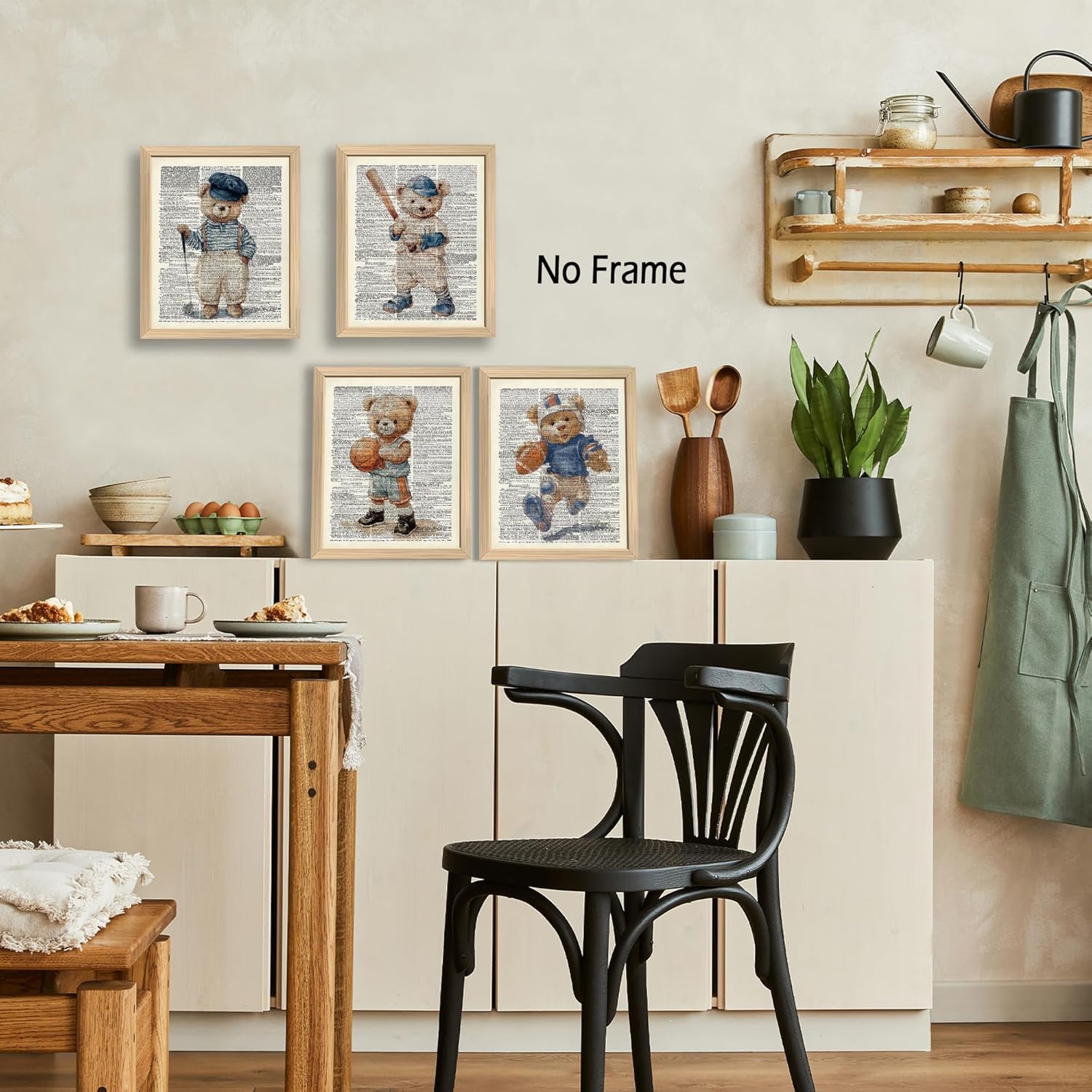 KSDUT Vintage Bear Sports Wall Decor Art Set of 4 - Retro Nursery Artwork Poster Prints Boys Room Wall Decor Kids Gifts Wall Art for Nursery Sports Room Dorm Decorations - 8"x10" Unframed
