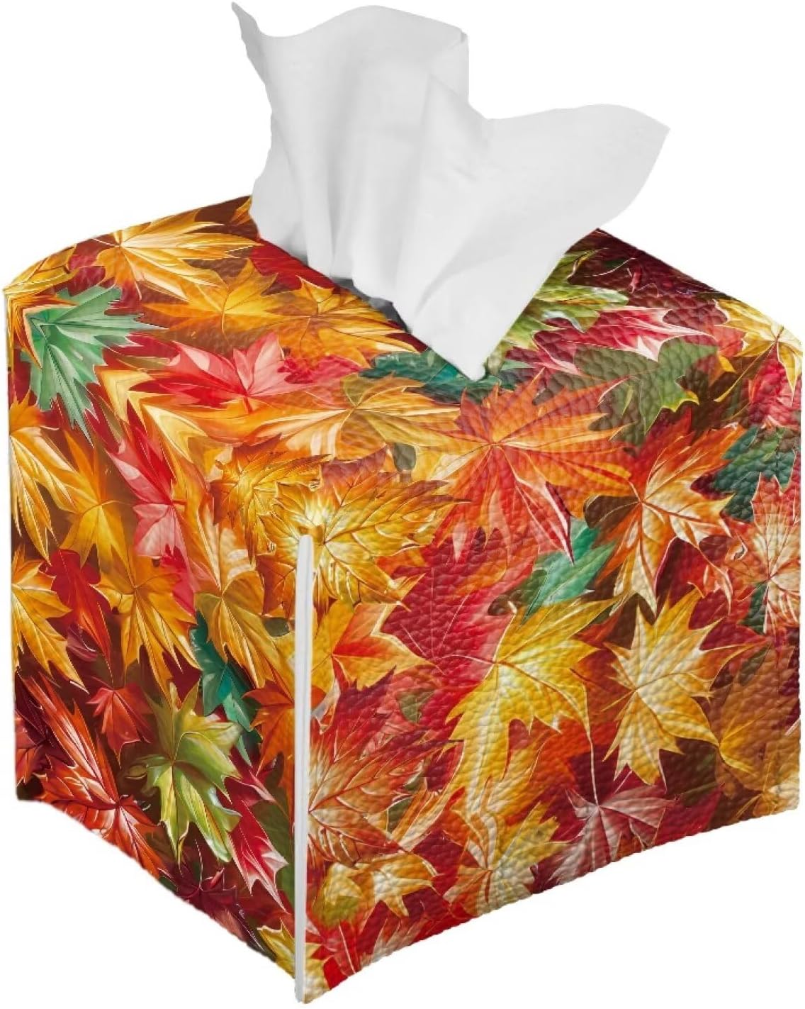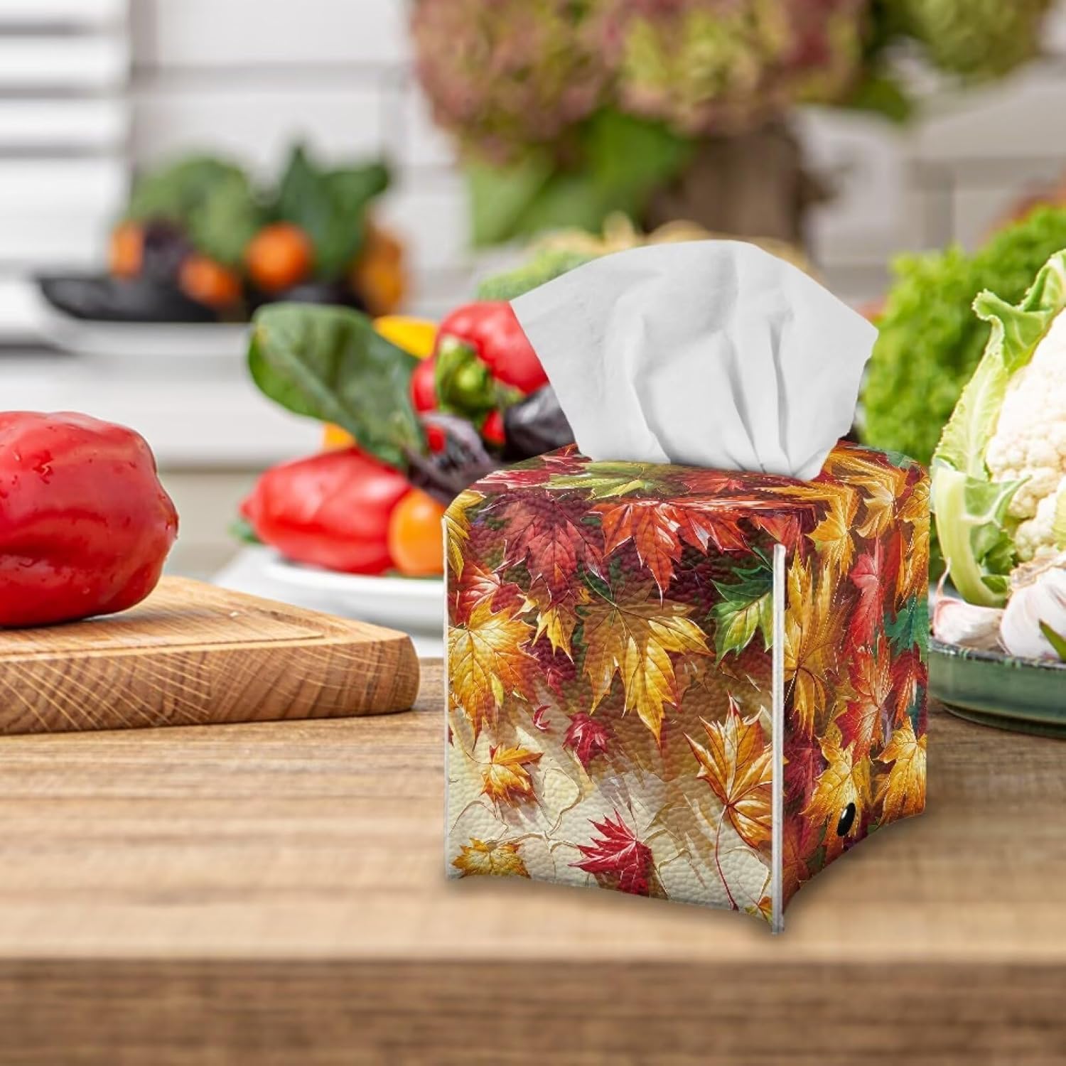 Maple Leaf Tissue Box Cover PU Leather Square Tissue Box Case Thanksgiving Theme Organizer Holder Foldable Waterproof Facial Paper Dispenser Easy to Install