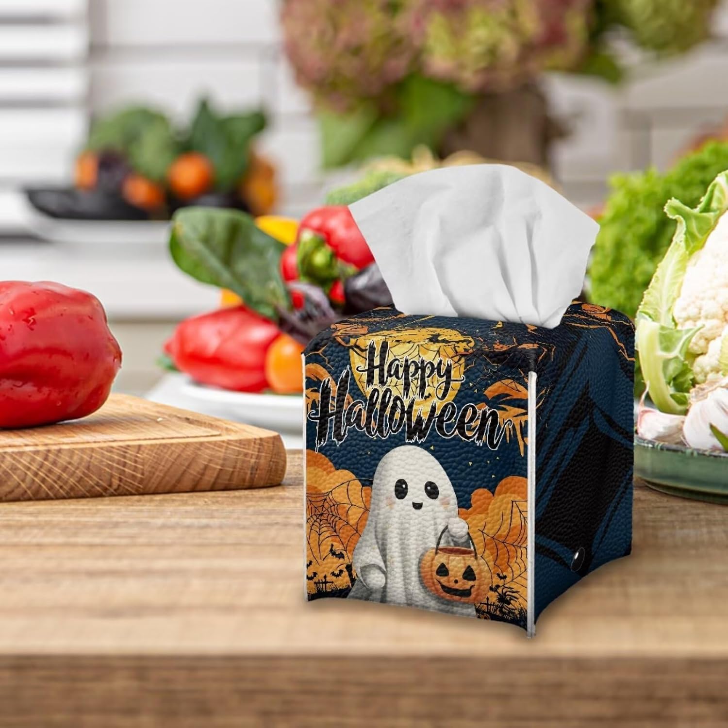Happy Halloween Tissue Box Cover PU Leather Tissue Box Holder 5x5x5 inch Waterproof Protective Cover Modern Home Car Office Hotel Decor