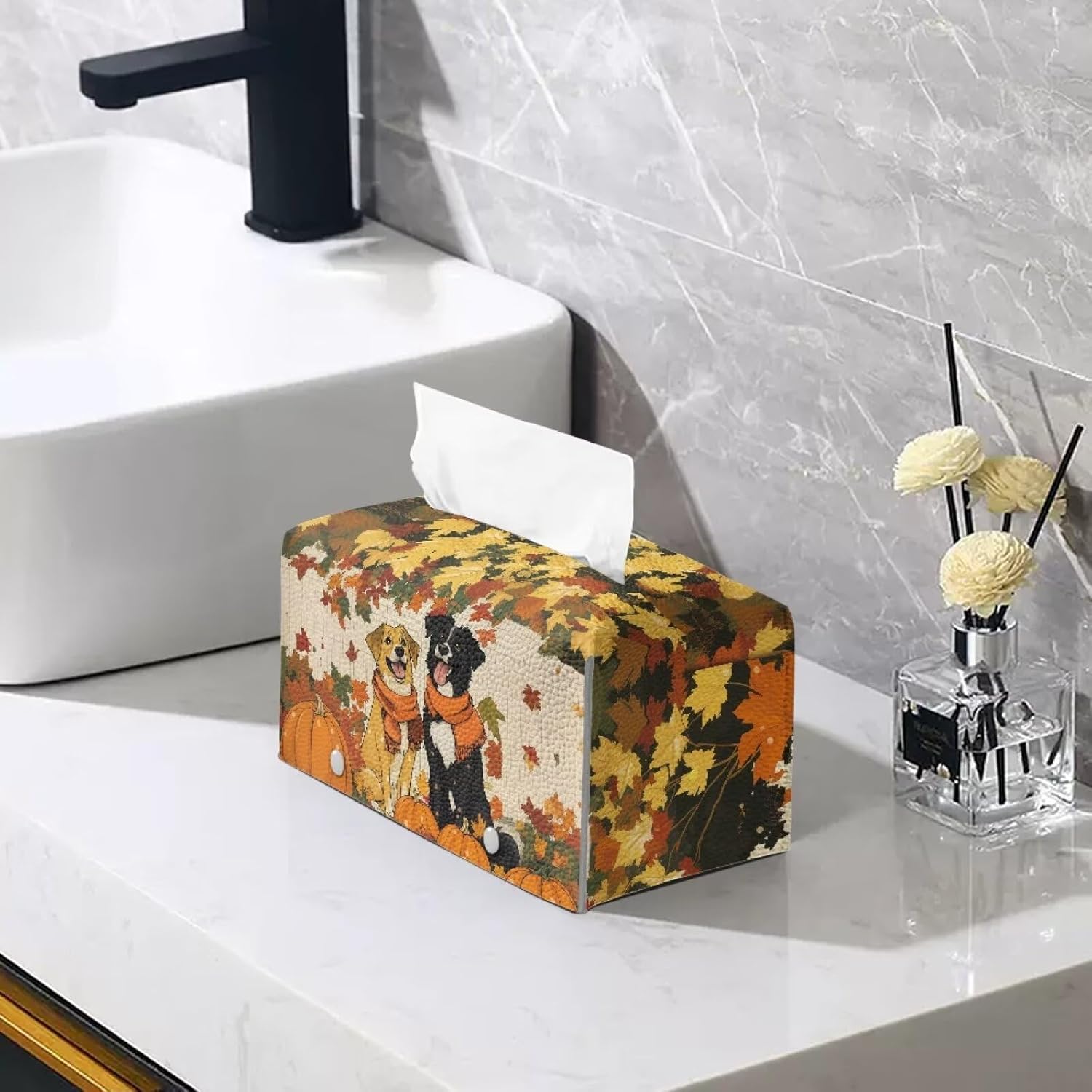 Cute Dog Tissue Box Cover Rectangle Tissue Box Cover PU Leather Facial Paper Holder Thanksgiving Decorative Napkin Organizer for Home Car Hotel Office Indoor Decorations