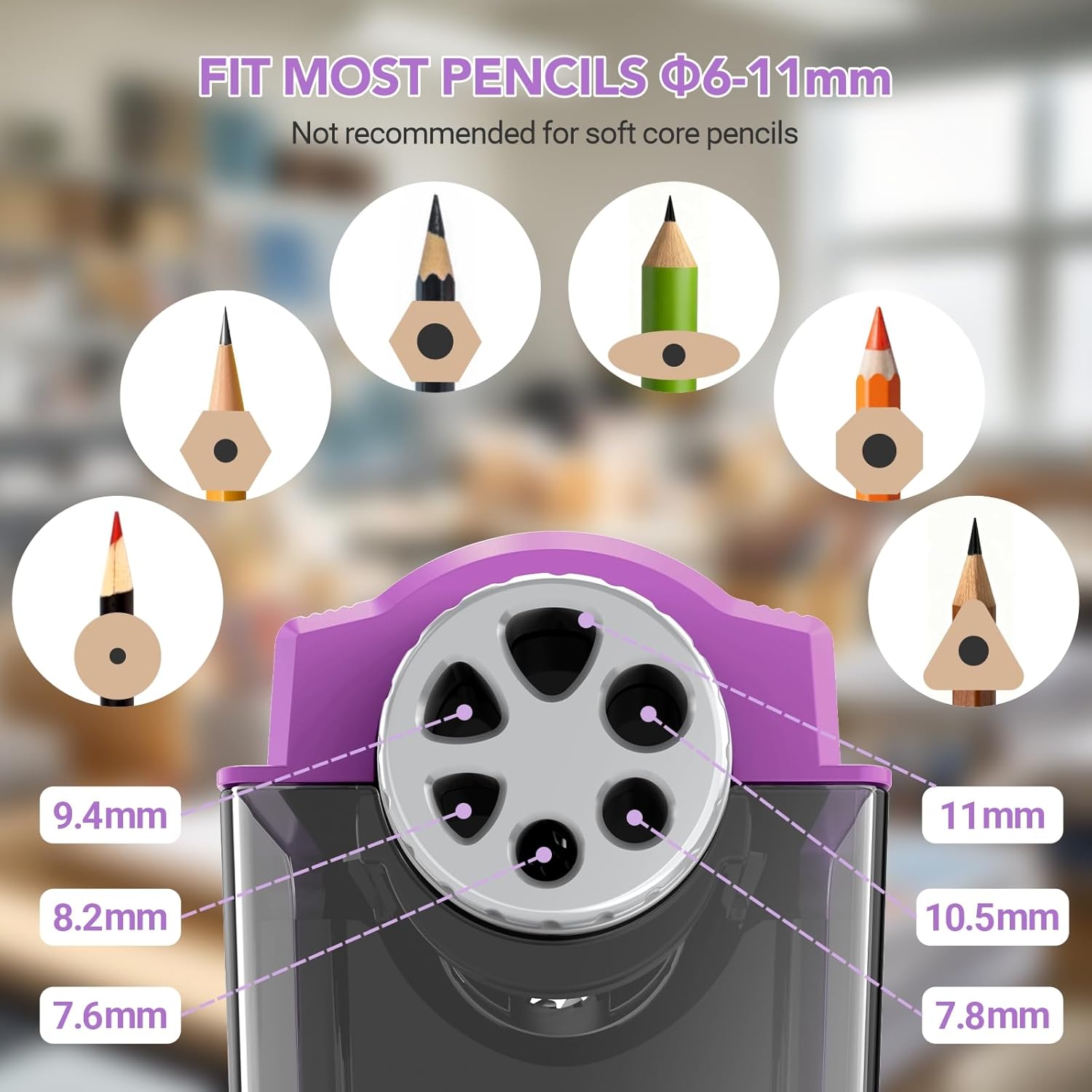 - 【6-Hole Pencils Sharpener: For Skinny & Jumbo Pencils】The 6 pencil holes of this electric pencil sharpener accommodate almost all your pencils varying in size(withiφ11mm) and shape(round, triangular, hexagonal, etc), and keep every pencil inside in such a way as to be snugly fitted in position while sharpening for even cutting. The point this electric sharpener gives on a pencil is sharp, even and also smooth for its integrated auto deburring process at the end of each sharpening cycle.