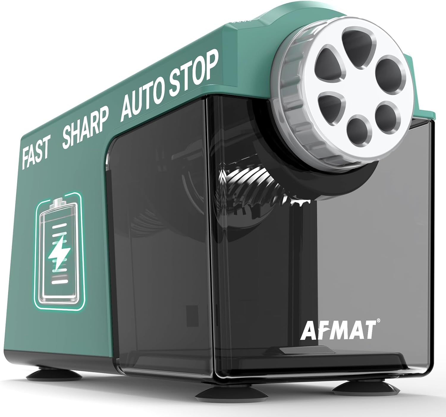 - 【Classroom Pencil Sharpener: Fast Sharpen in 3S & SAVE PENCILS】AFMAT classroom pencil sharpener sharpens pencil incredibly fast(Less than 4s for new and 2s for used) and to a fine point w/o. breaking the tips, which makes it a teacher’s dream sharpener for its speed, efficiency, and breakage-free feature. It will auto stop once pointy keeps every pencil from being over sharpened and shave wood off as little as possible so it doesn’t wear down the pencil like most being electric.