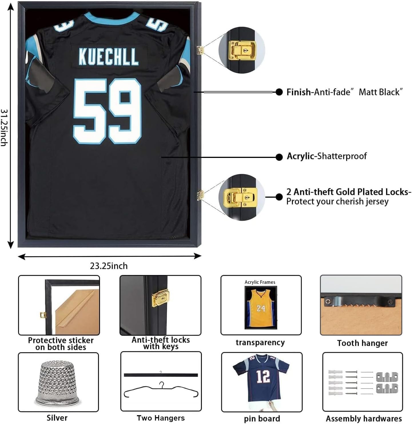 - HIGH QUALITY WITH RELIABLE FEATURES - Made out of wood with Anti-fade Matt Black finish, IHEIPYE Jersey Frame is durable enough for a long-lasting working life. Shatter Proof transparency and UV protection acrylic glass panel, two plated anti-theft locks can well protect your cherished sports memorabilia or collectibles. Customer-friendly accessories and visual user manual are packed all together with our sincere service!