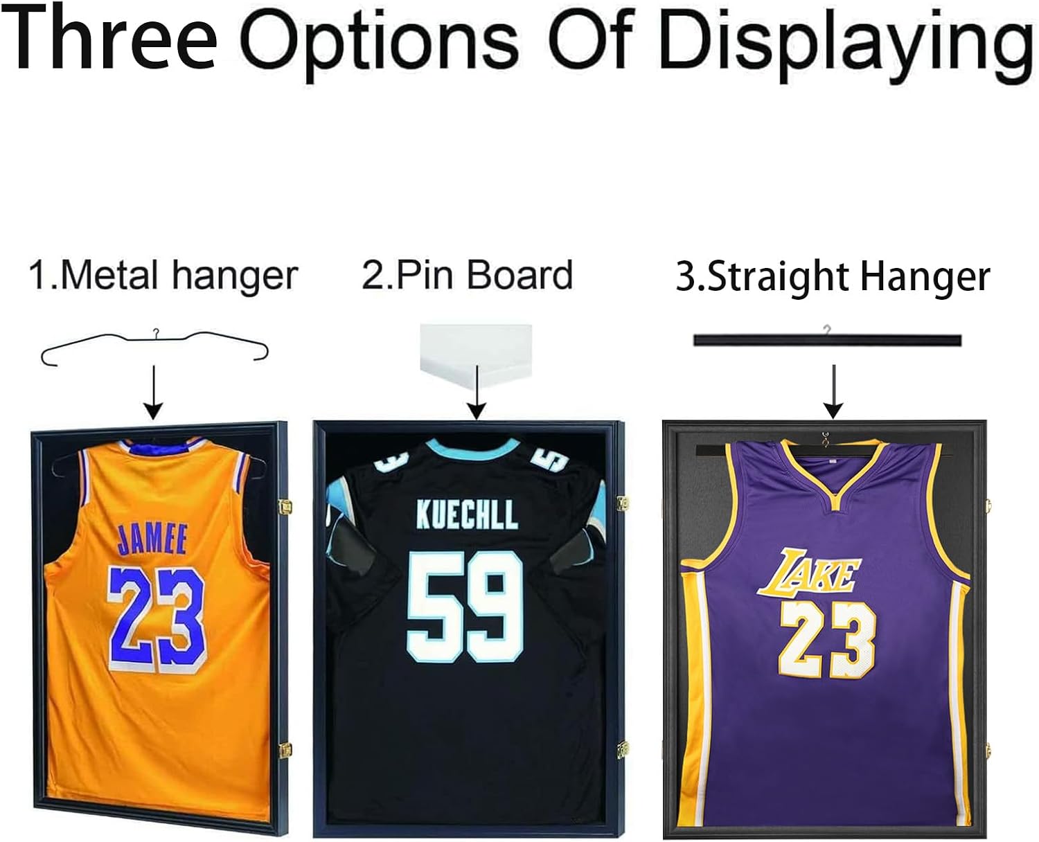 - THERE SELECTABLE DISPLAY METHODS - TWO hangers and Pin Board allow you to display your jersey in 2 different ways. The Metal hanger works better for small football Jersey Shirt . The Wood hanger works better for sleeveless jersey like basketball shirt.While the pin board features a tight,without any wrinkle display, better for long-sleeved jersey such as football and hockey jersey. The jersey display shadow box comes assembled, easy set up in minutes!