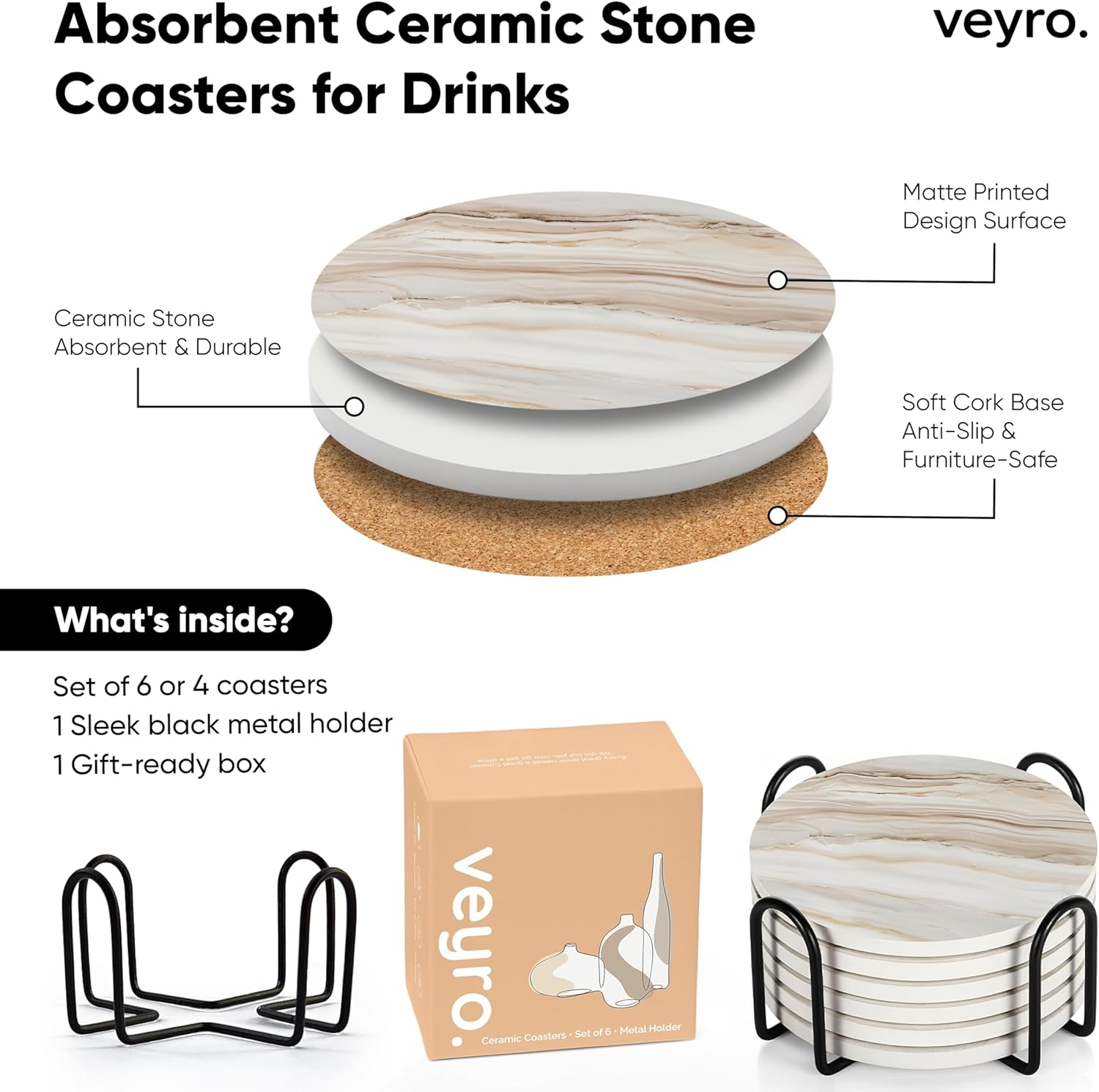 - ABSORBENT CERAMIC STONE: VEYRO coasters for drinks are crafted from premium ceramic that is naturally absorbent, gently drawing in water rings and condensation before they touch your surfaces. Designed with balance and precision, they keep your coffee tables and desks spotless — so every sip feels calm, effortless, and beautifully in place. Perfectly sized for mugs, tumblers, wine glasses, and even vases or small planters.