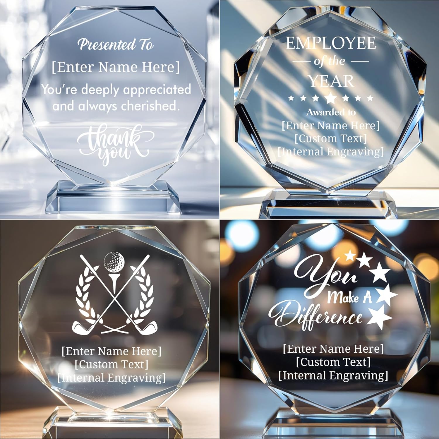 • [Custom Crystal Trophy Awards] Add names, dates, logos, messages—or even team photos—to celebrate achievements big and small. Whether it's employee recognition, a farewell tribute, or a sports victory, this custom trophy adds a personal touch to every occasion. Turn meaningful moments into lasting memories with a personalized crystal award.
