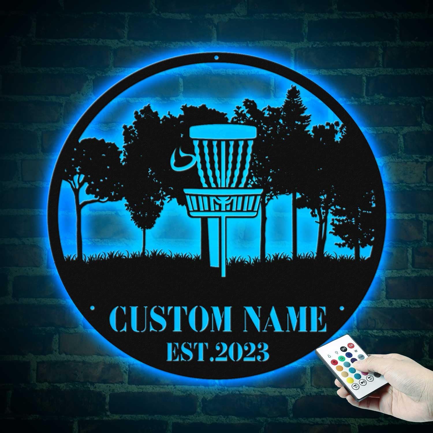 Custom Disc Golf Basket LED Metal Wall Art – Personalized Metal Sign with Remote, Sports Wall Decor for Boys Room, Game Room Gift for Men, Disc Golf Lover Present Model-Disc02