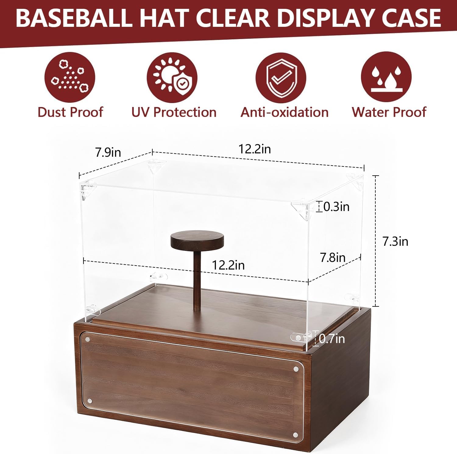 Baseball Hat Display Case, Uv Protection Signed Hat Transparent Showcase, Clear Acrylic Sport Cap Holder Stand Display Box with Solid Wood Base Risers, Ideal Gift for Cap Collector