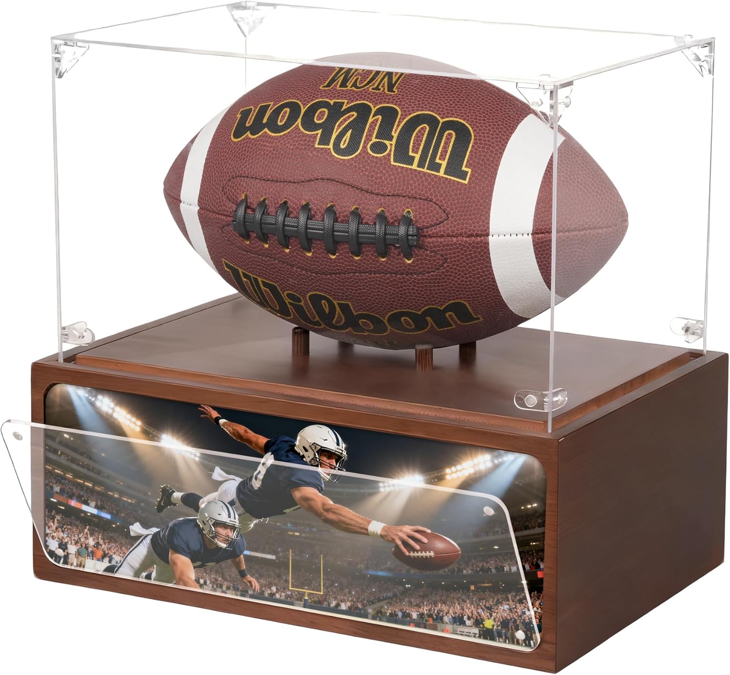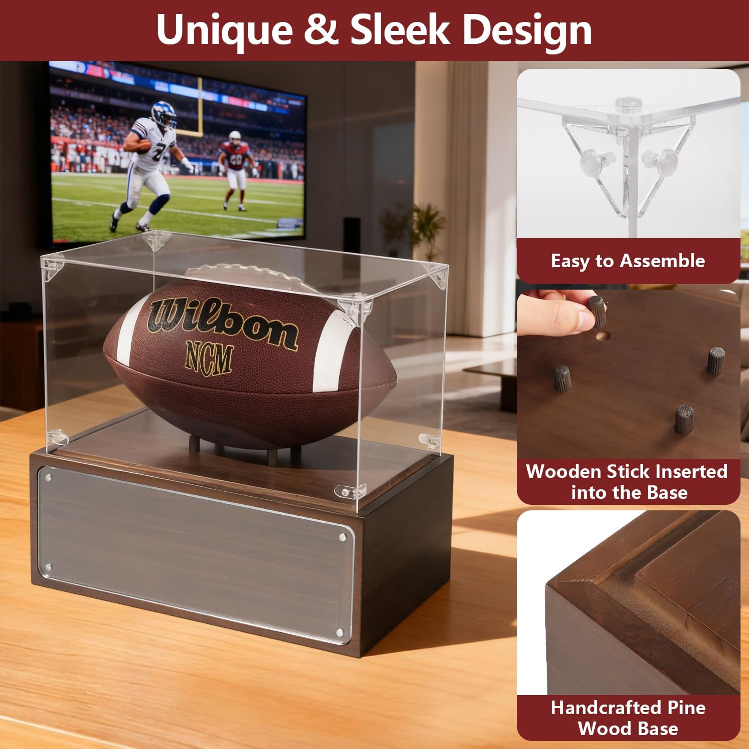Football Display Case Stand with Solid Wood Base, Uv Protected Acrylic Rugby Case Display Clear Autographed Football Holder, Standard Memorabilia Keepsake Required Football Display Box
