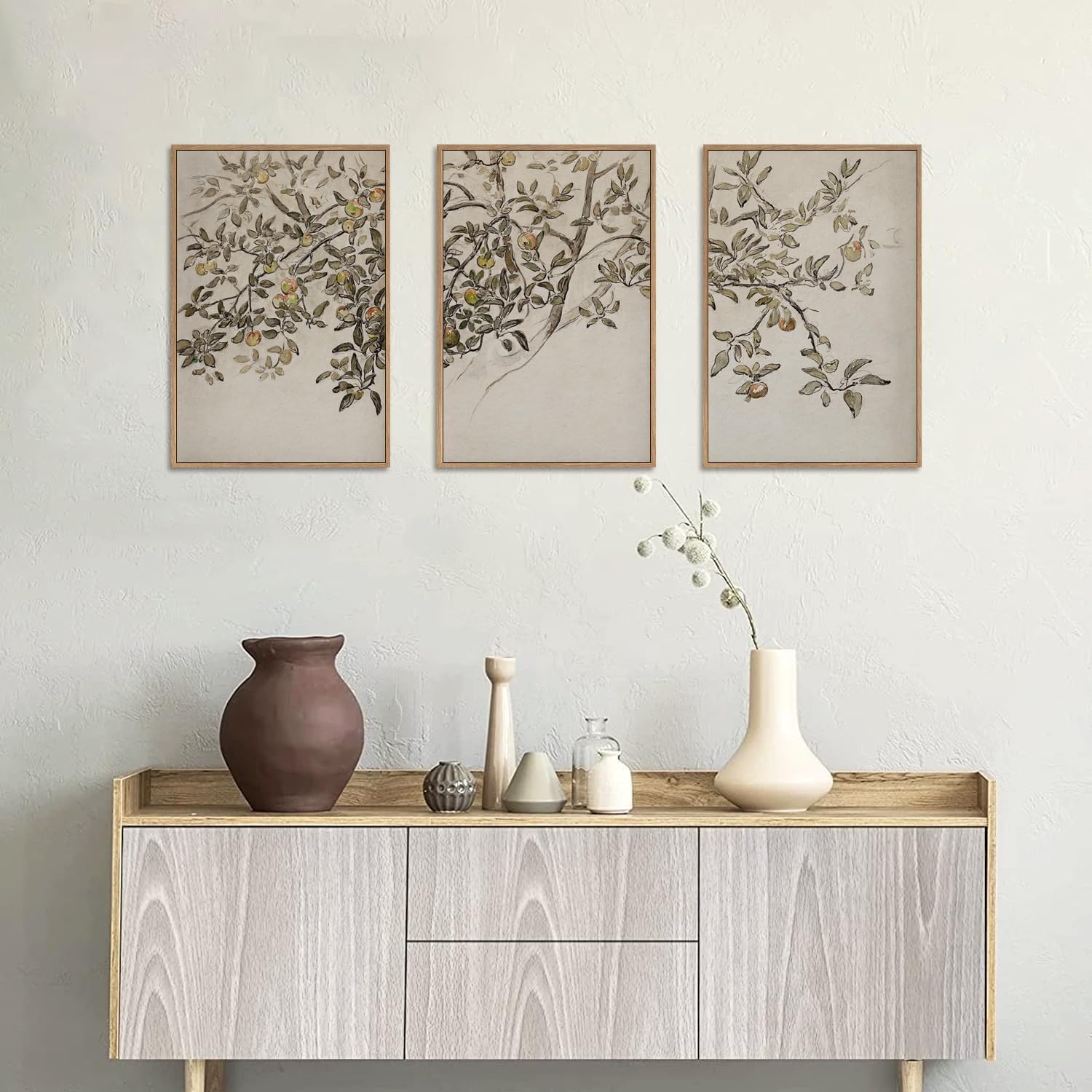 MTFBWY Framed Botanical Apple Tree Wall Art Set of 3, Vintage Nature Branch Canvas Prints, Rustic Farmhouse Plant Wall Art, Neutral Still Life Painting for Living Room Bedroom Office Decor, 24L x 16W