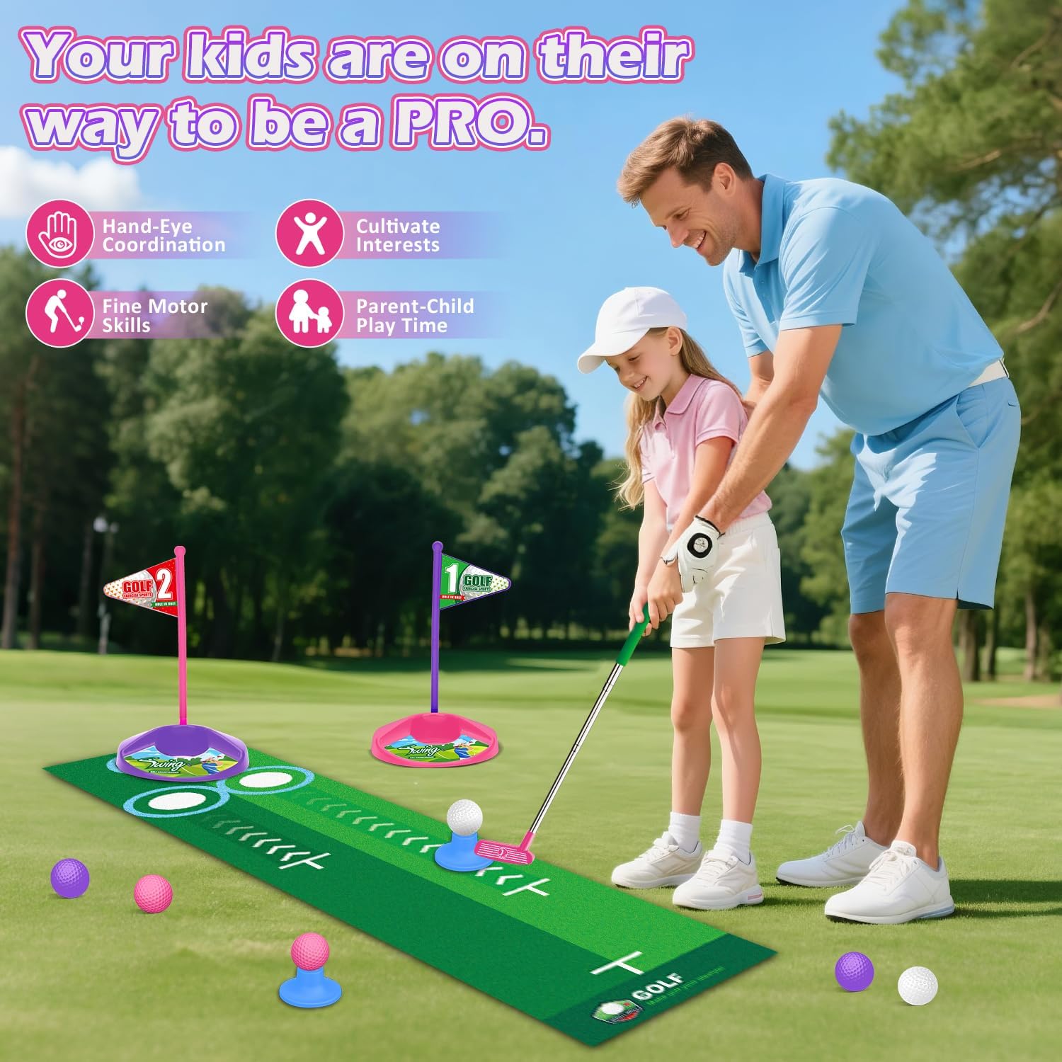- 【16PCS Rich Accessories】This Toy golf ball sets for kids includes everything kids need to start learning the game, including Auto golf ball returner*1, Golf Putting Mat*1, Length Adjustable Golf Clubs*3, Lighting Golf Balls*2, Green Golf Balls*2, Black Golf Balls*2, Golf Tees*2, Golf Targets*2, Sticker*1. With kids golf toy sets' easy set-up, kids will be playing within minutes.