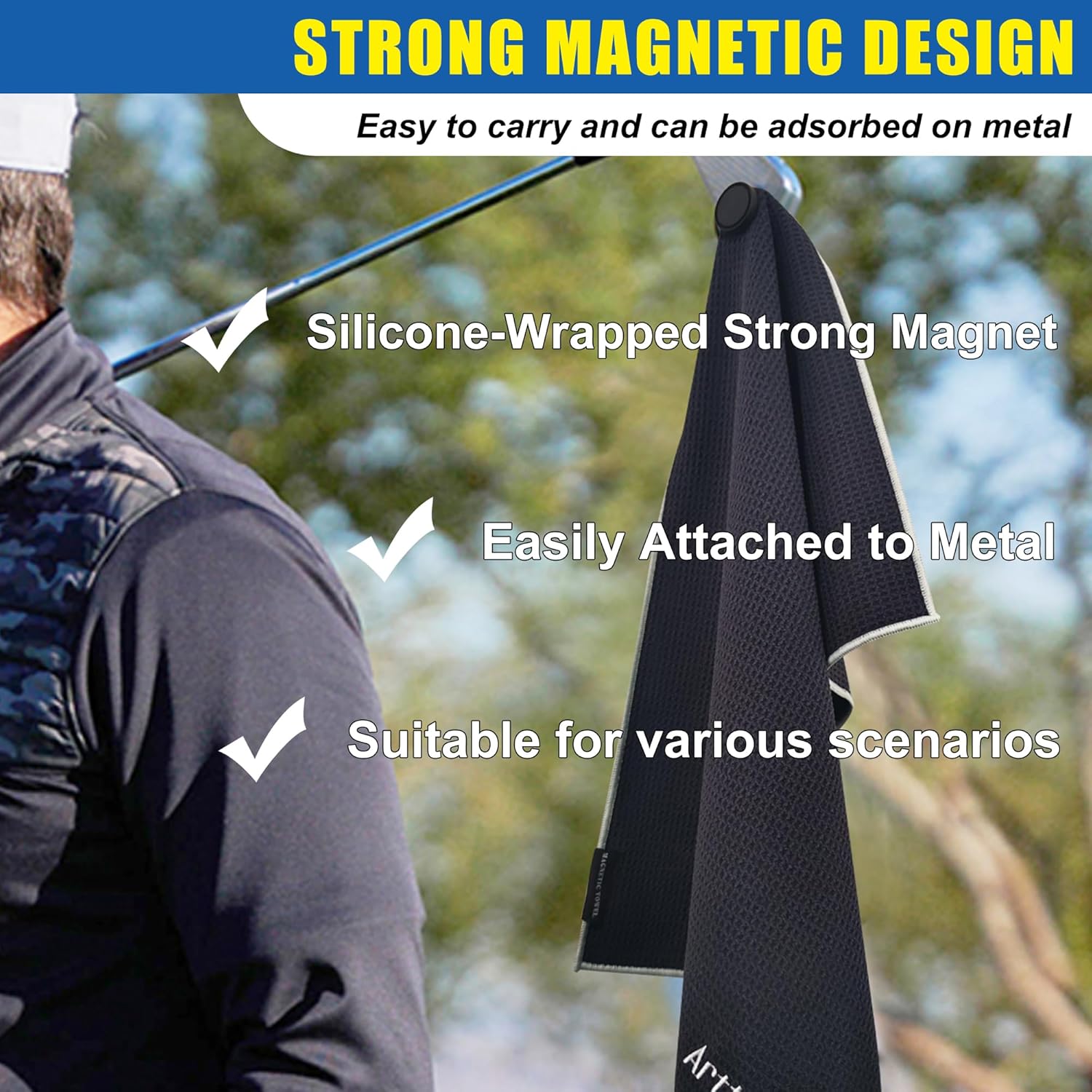 - Magnetic Golf Towel: Built-in powerful magnet securely attaches to golf cart and bag. The towel is made of fiber, making it more absorbent than cotton and more effective at removing dirt and grass clippings