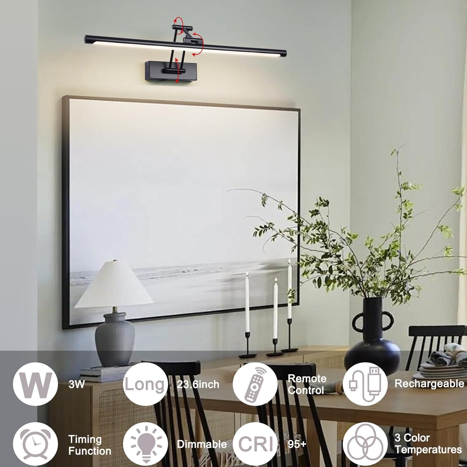 LED Battery Operated Picture Lights with Remote Wireless Art Lighting for Wall 23.6 Inch Rechargeable Painting Light Black Frame Lights Dimmable 3CCT Gallery Light for Library Portrait