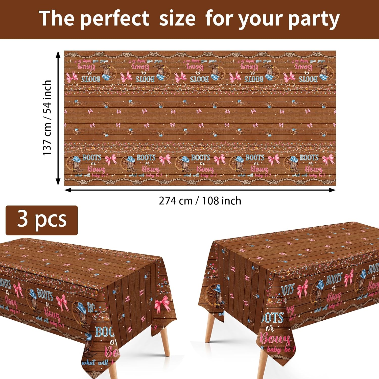 - 3Pcs Cowboy Boots or Bows Gender Reveal Tablecloths: You'll receive 3 cowboy boots or bows plastic tablecloths, which measures about 274 x 137cm / 108 x 54 Inches, enough to cover most round, square or rectangular tables. These patterned tablecloths will add a special touch to your cowboy boots or bows gender reveal party and create unforgettable memories