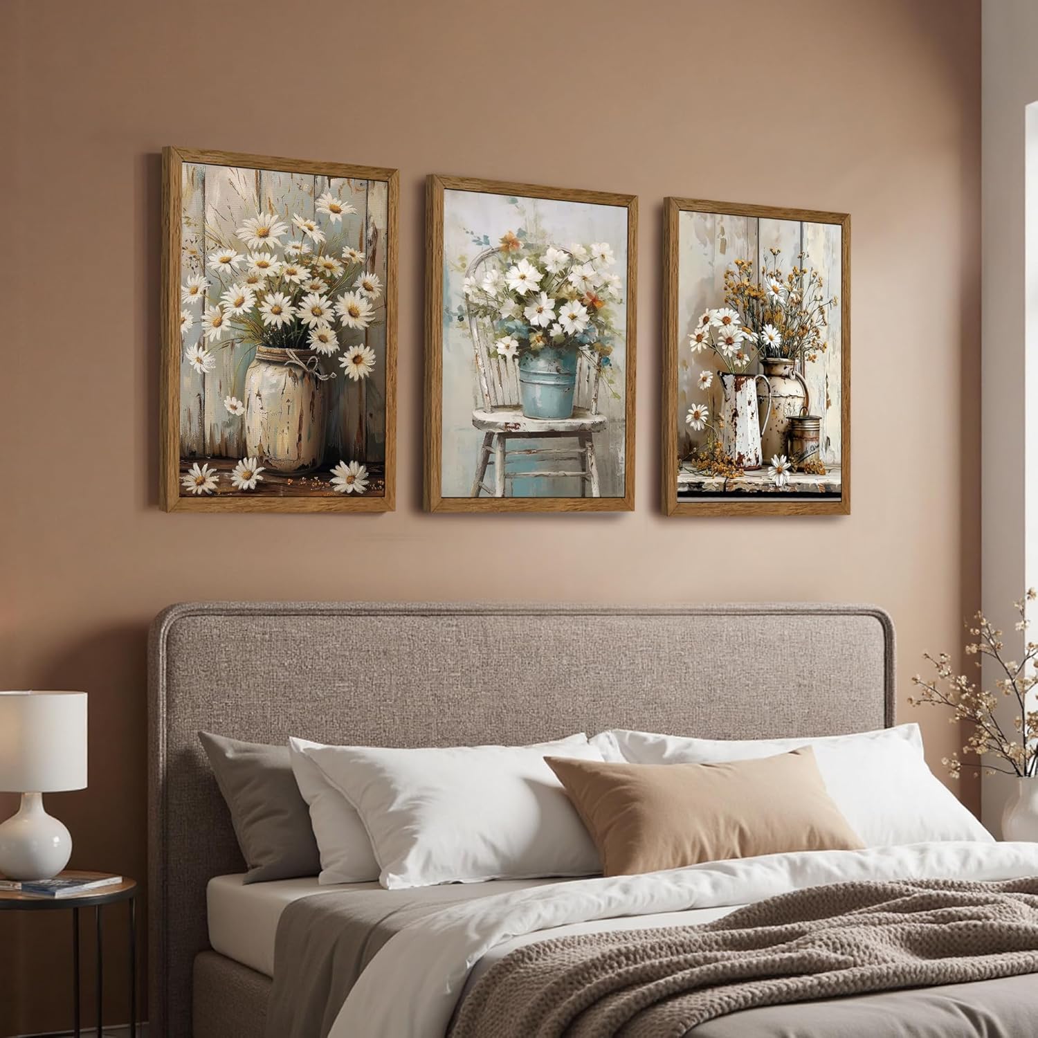 DUWQU 3 Piece Framed Elegant Farmhouse Canvas Wall Art, Vintage Floral Pictures Art Wall Decor, Nature Themed Daisy Art Prints for Living Room Bedroom Kitchen and Office Ready to Hang 16×24 Inches