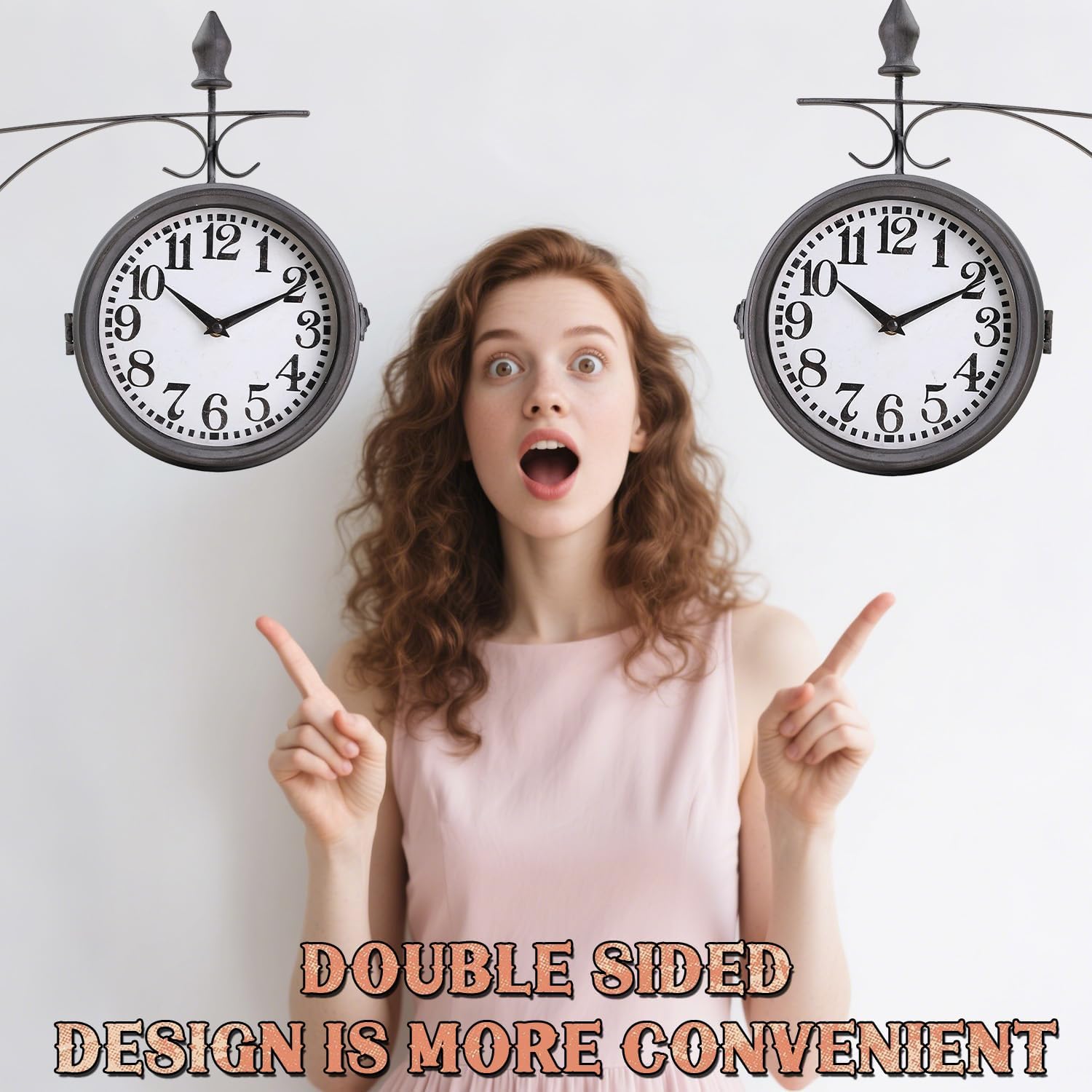 - DOUBLE-SIDED HANGING CLOCK--Features a classic double-sided layout with a rustic grey frame and white dials, perfect for enhancing corners, hallways, outdoor patios, farms, living rooms, and kitchens with elegant retro charm. Instantly adding a touch of vintage style of every angle of your home.