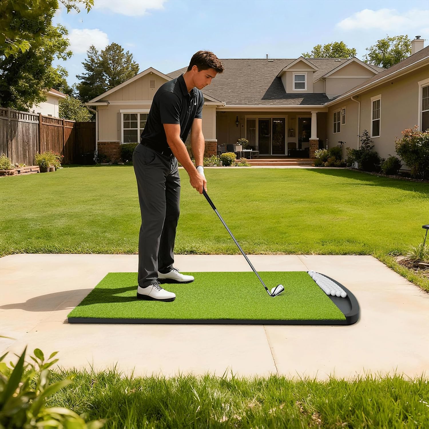 - 1. Patented Arc-Shaped Ball Tray Design: Featuring a unique arc-shaped built-in ball tray, this patented all-in-one golf hitting mat allows effortless practice. The ergonomic arc design helps you hit continuously without bending down to pick up balls, keeping your rhythm and focus on every swing.