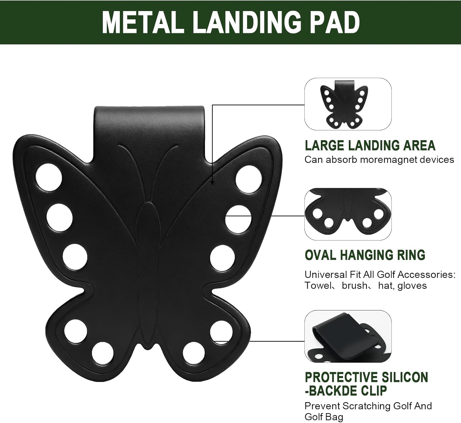 - The large metal landing pad is easy landing your magnetic golf accessories, like range finder with magnet, magnetic golf towels. The finely designed hole for your to hang your gloves and other accessories. A silicon clip ensure your club shafts scratch free.