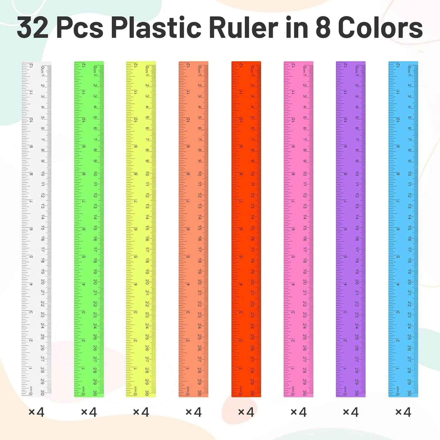 - Minimalist Design: This large pack contains 32 pieces 12 inch rulers in eight vibrant colors (blue, orange, pink, green, yellow, purple, red, and clear). These 12 inch rulers are great for group activities, bulk office orders, or activity kits, where simple color coding can help organize tasks and workstations