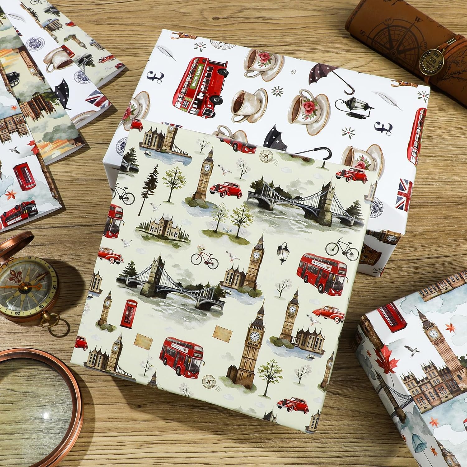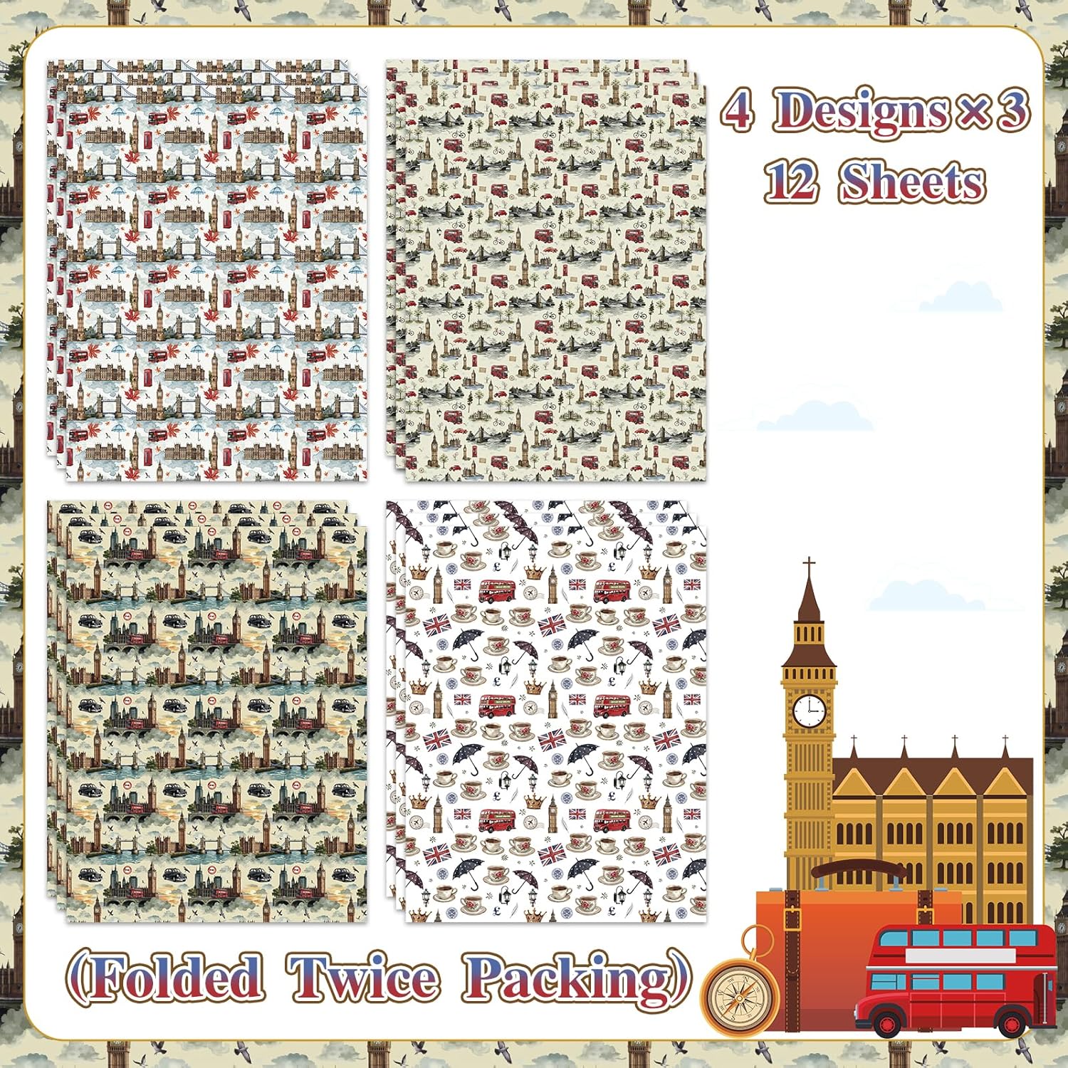 - 12 SHEETS OF BRITISH-THEMED DESIGNS:This set includes 12 high-quality wrapping sheets,featuring 4 unique London-inspired designs (3 sheets per design).Perfect for gifts with a British twist,the patterns showcase iconic landmarks like Big Ben,Tower Bridge,classic umbrellas,and more.