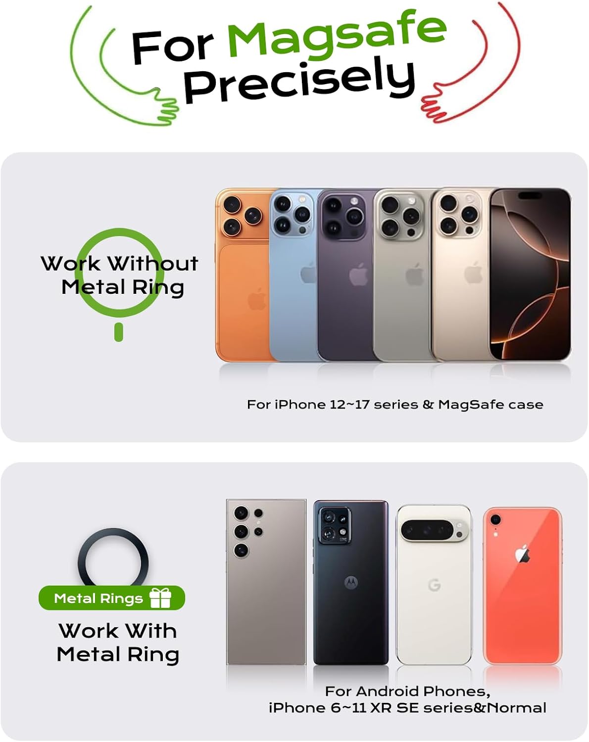 - [Works With All Phones]: This golf cart cell phone holder fits iPhone 12–17 series, compatiable with MagSafe cases. Also works with other phones using the included metal ring