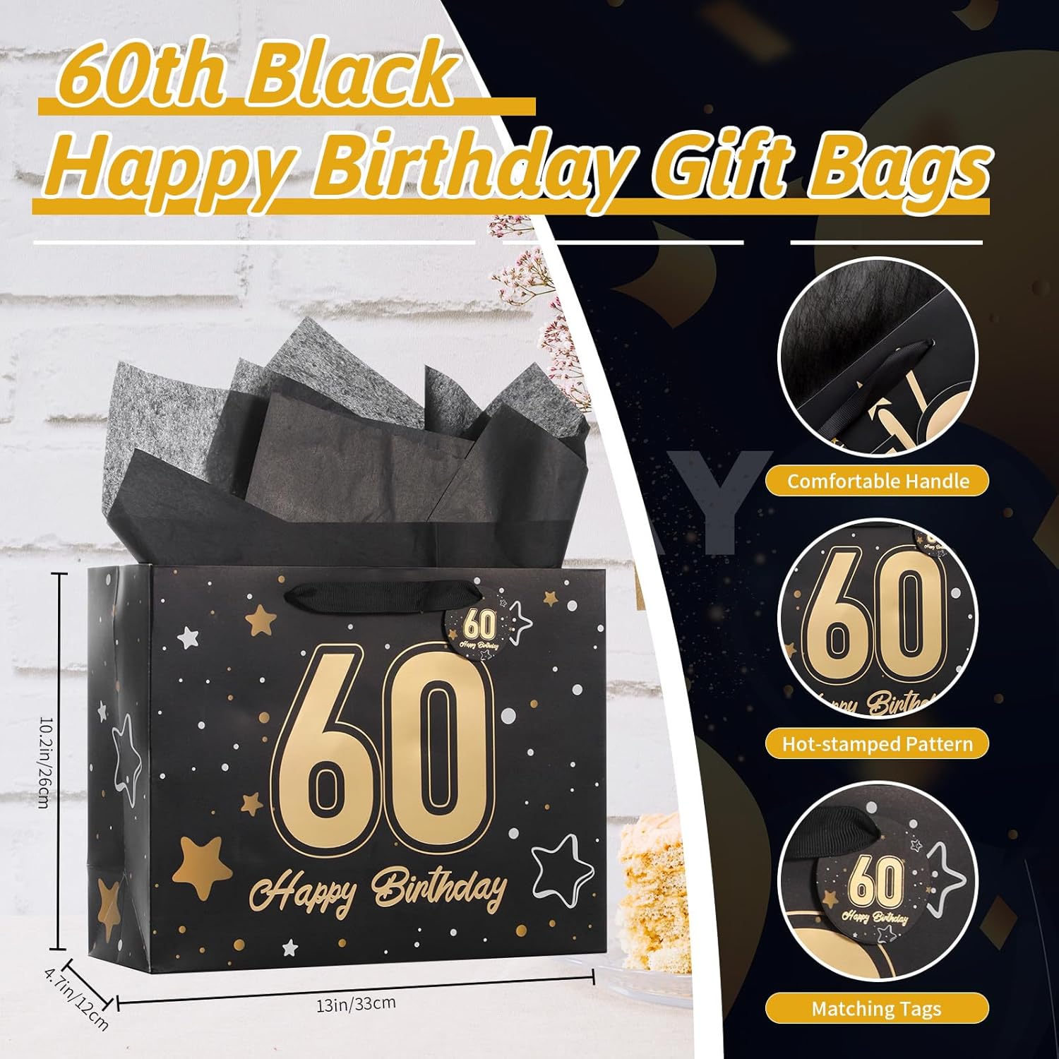 Powbrace 13" Black Happy Birthday Gift Bag with Tissue Paper and Greeting Card for Party,Happy Birthday Gift Bag for Men Women,Gift Bags Medium size(1 Black 60th)