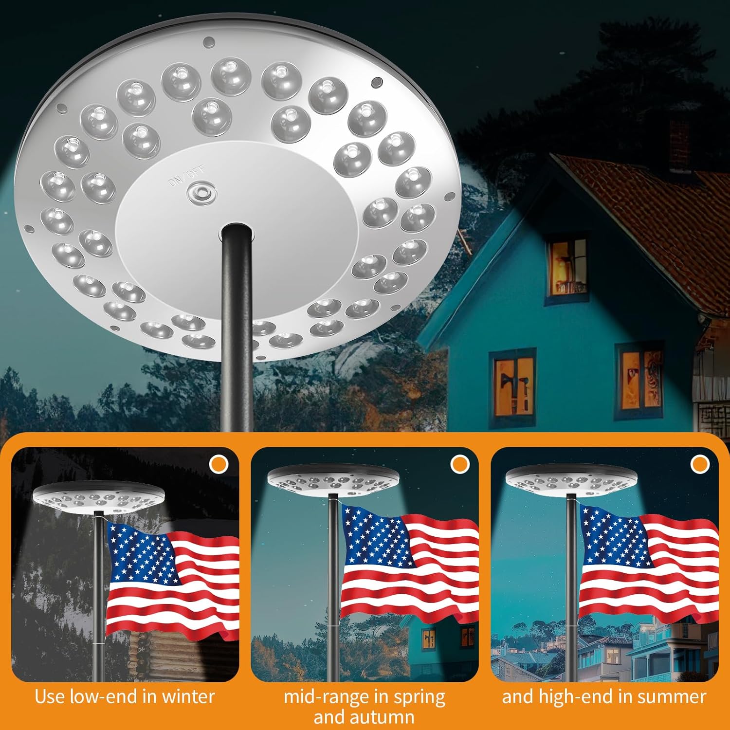 - SUPER BRIGHT SOLAR FLAG POLE LIGHT - 2000 lumens solar flag pole light uses LED beads with wider circumference to ensure 100% flag coverage. The flagpole light features three brightness adjustment modes: high, medium and low, you can easily switch the brightness by just pressing the on/off button. The solar light can work continuously for 16 hours in high brightness mode, 21 hours in medium brightness mode, and 32 hours in low brightness mode, which ensures sufficient lighting all year round.