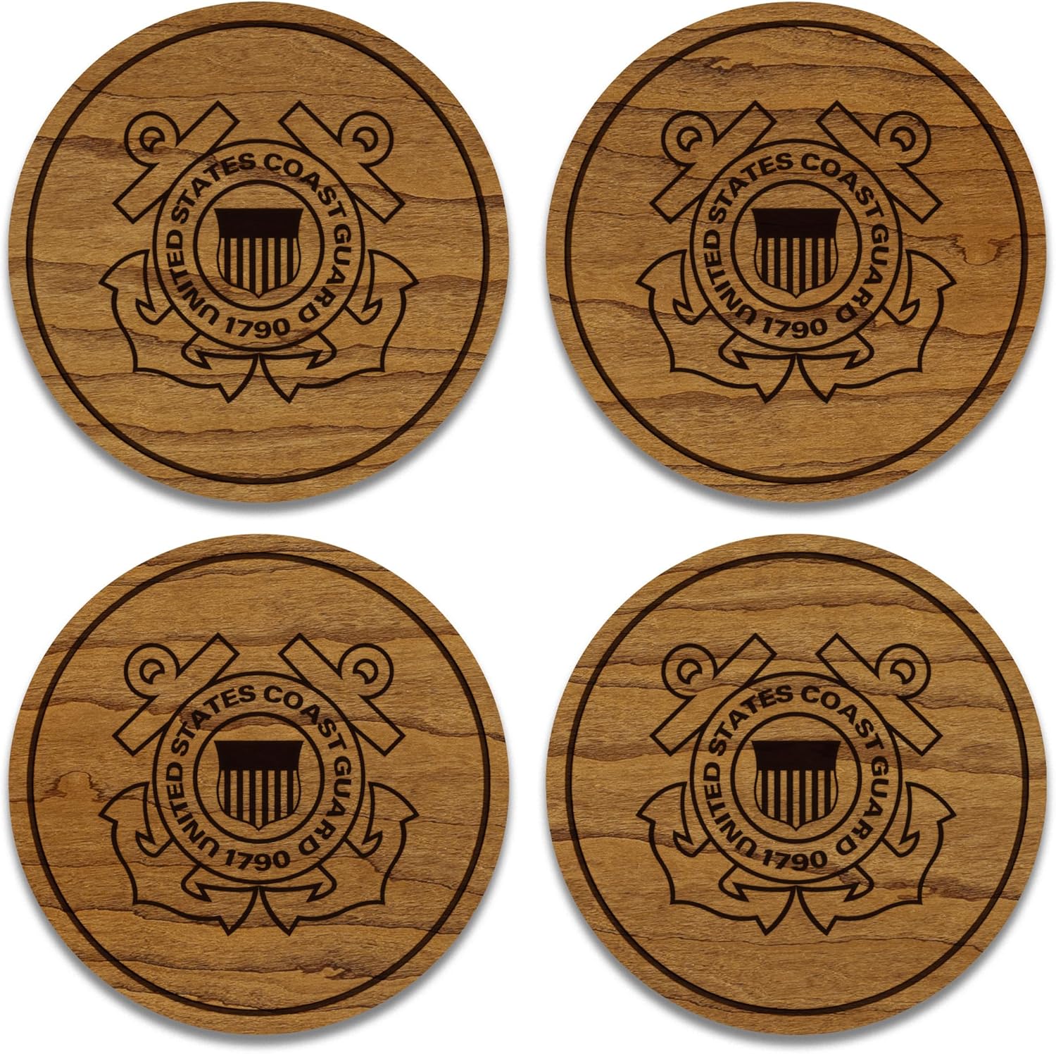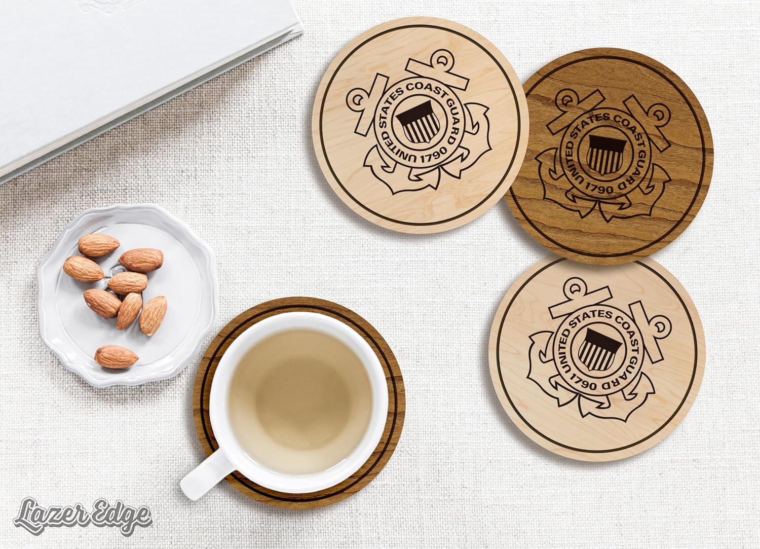 LazerEdge U.S. Coast Guard Wooden Coaster Set β Cherry Wood β Handcrafted Collectible 4-Pack | Made in USA | Officially Licensed Product