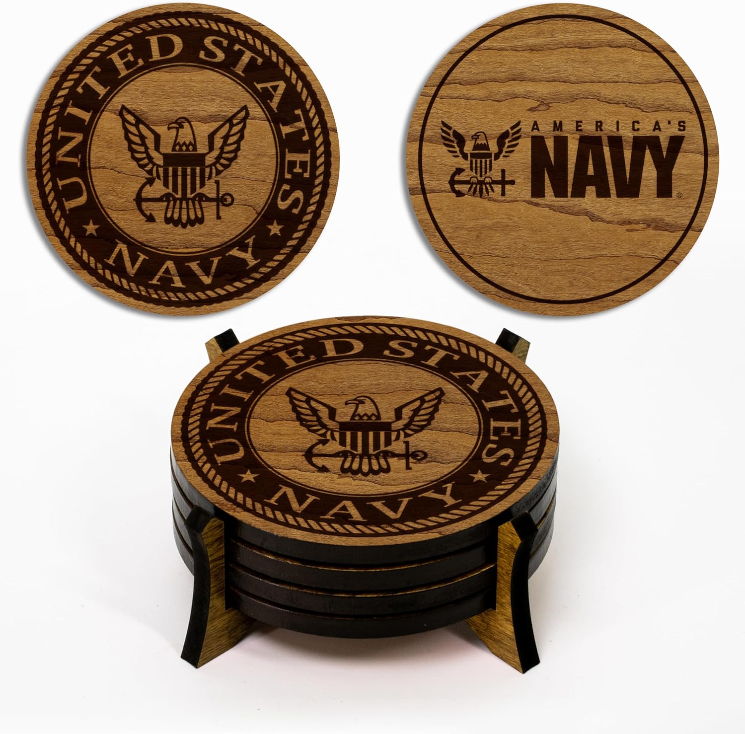 LazerEdge United States Navy Wooden Coaster Set β Cherry Wood β Handcrafted Collectible 4-Pack | Made in USA | Officially Licensed Product